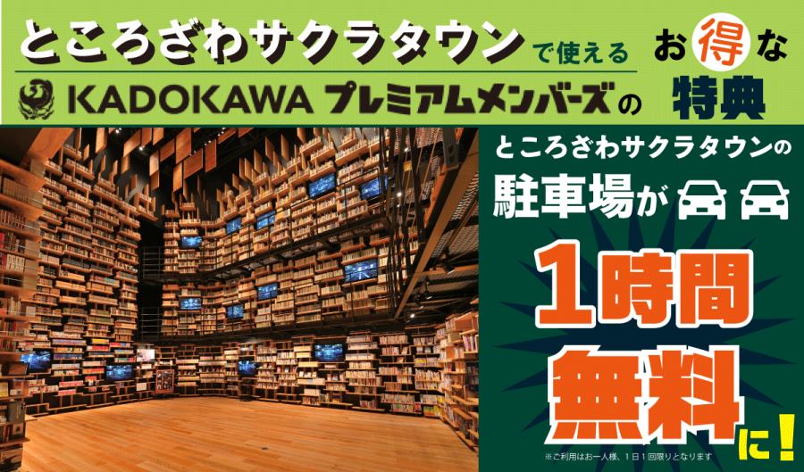 KADOKAWAプレミアムメンバーズに登録すると、ところざわサクラタウンの駐車場が1時間無料になります。 プレミアムメンバーズ会員証をサクラタウンの総合案内所でご提示ください。1時間分の駐車券を差し上げます。 ※お一人様、1日1回限りとなります ※2時間以内の駐車の場合、1時間分が割り引かれます