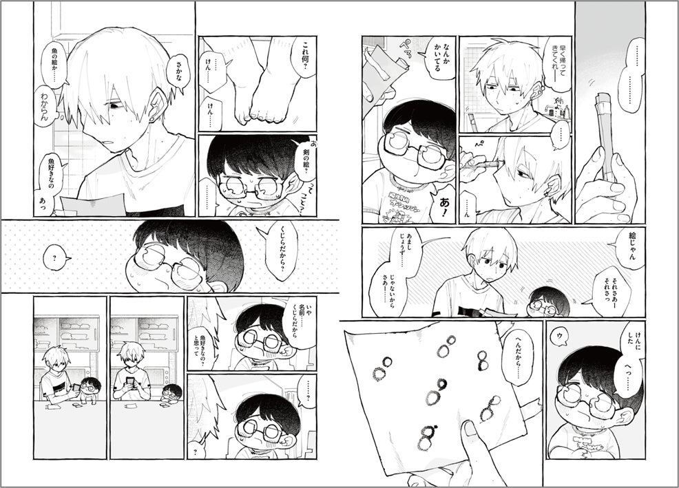▼あんまり上手じゃないからと、魚の絵を丸めて剣にしていたくじら。それに気づいたシロは…(1話より)
