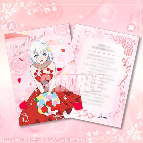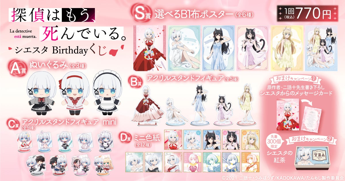 商品は、ヒロイン・シエスタの誕生日を記念した、アニメスタジオ新規描き下ろしイラストによるオリジナルグッズとなります。華やかなドレスを着た美しいシエスタや、猫耳が可愛いヒロインたちを描いたイラストの商品とともに、シエスタの誕生日を祝いましょう! 期間中10連くじをご購入いただいた方にはもれなく「原作者・二語十先生書き下ろしシエスタからのメッセージカード」をプレゼント! また、先着300個限定で「シエスタの紅茶」もプレゼントいたします! この機会をお見逃しなく!!