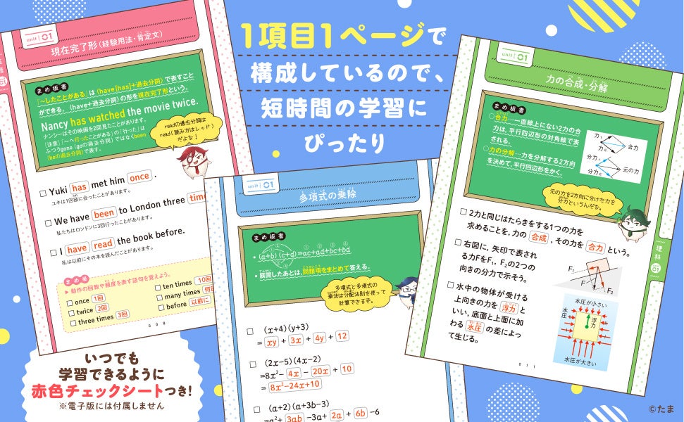 1項目1ページなので、いつでもどこでも、空いた時間に学習できます。重要知識をしっかり掲載しているので、定期テスト対策にも効果的。
