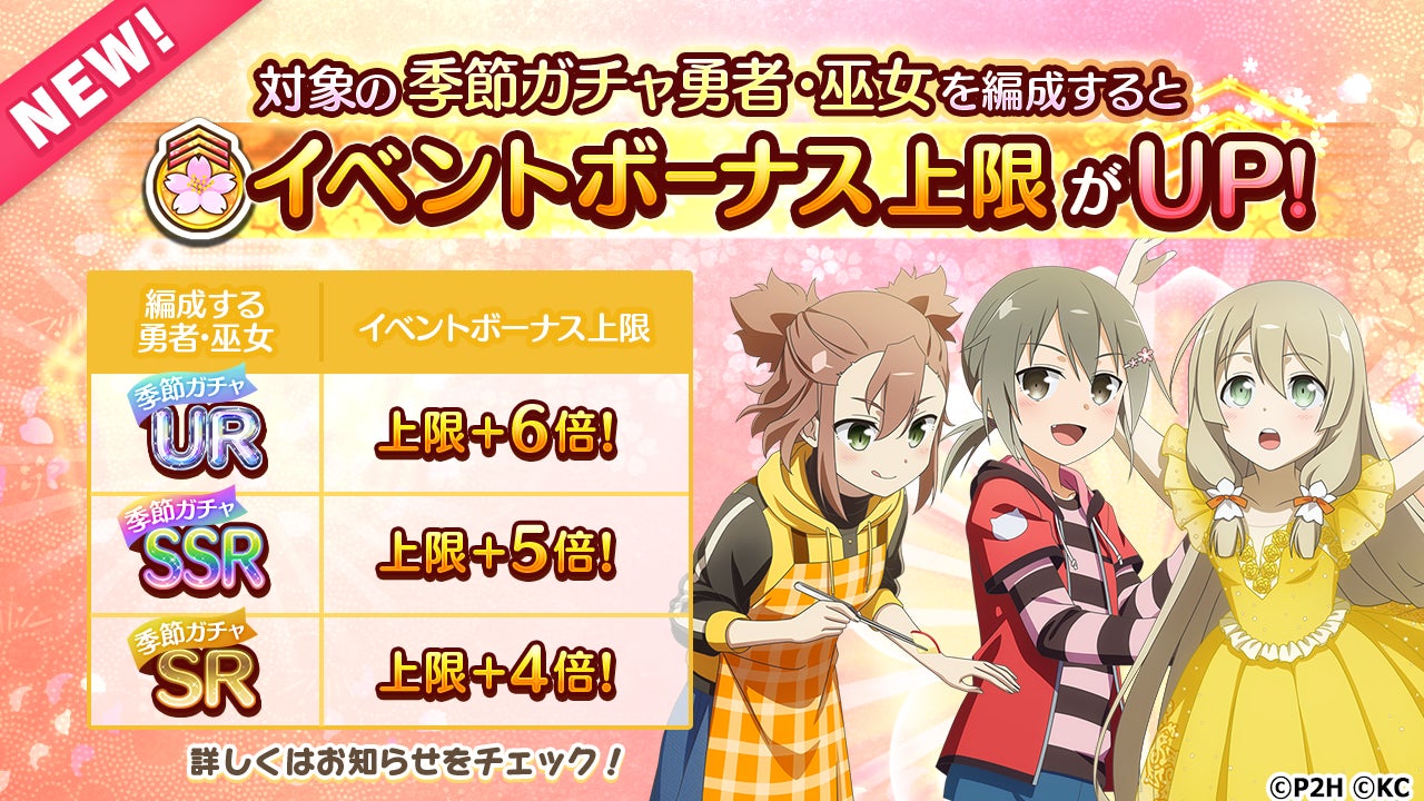 対象の季節ガチャ勇者・巫女を編成しイベントに挑戦すると、季節のいろどりがさらに獲得しやすくなりました!
