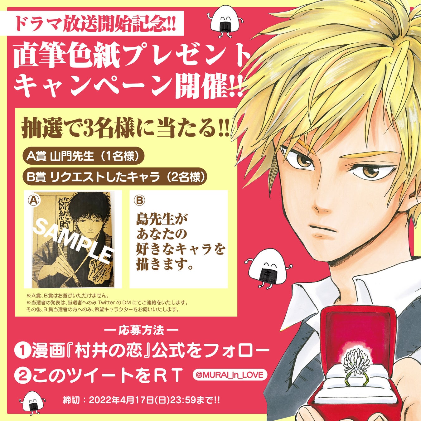 村井の恋公式Twitter(@MURAI_in_LOVE)をフォローし、所定のキャンペーンツイートをRTすると、本作の中でも人気が高い、村井最大のライバル(⁉)山門先生が描かれた色紙が1名様に、島先生がご希望に応えて好きなキャラを描く色紙が2名様に当たります!!