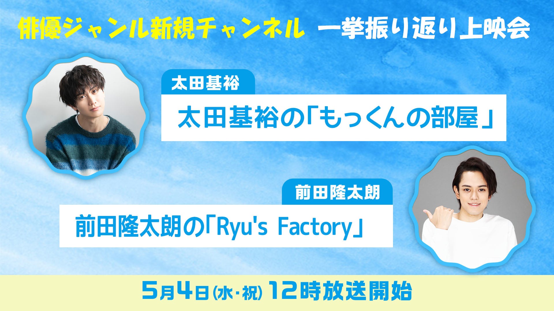 また今回は、2021年12月に個人でニコニコチャンネルを開設した、太田基裕のチャンネル「もっくんの部屋」、前田隆太朗のチャンネル「Ryu's Factory」から全5回分の放送(※放送当時無料配信した部分のみ)も、合わせて配信されることが決定。