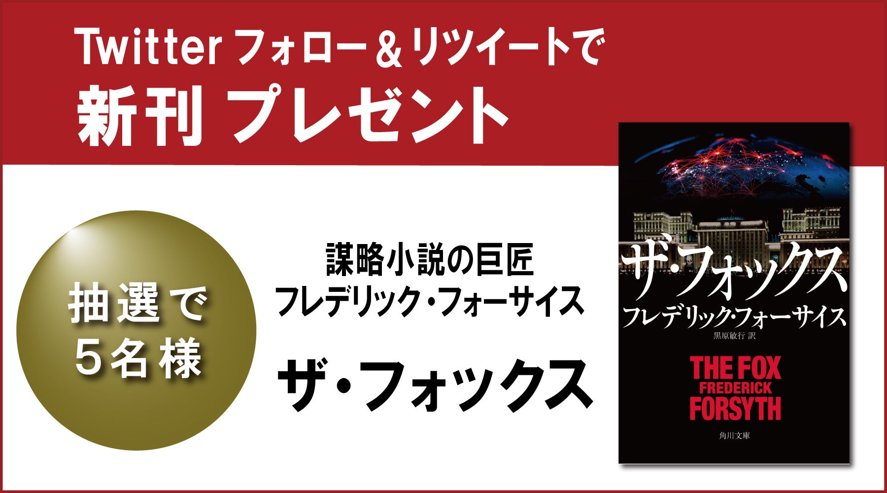 <Twitterプレゼントキャンペーンについて> ・プレゼントキャンペーン名称 『ザ・フォックス』プレゼントキャンペーン【2022】 ・賞品 『ザ・フォックス』を、5名様にプレゼント! ・応募方法 (1) KADOKAWA翻訳書籍Twitterアカウント「@kadokawahonyaku」をフォローする。 (2)注意事項を確認し、キャンペーン告知ツイートをRT(リツイート)する。 (3)エントリー完了! ・応募しめ切り 2022年5月26日(木)23:59RT分まで ・当選発表 当選者へのみ、Twitterのダイレクトメッセージ(DM)で「KADOKAWA翻訳書籍(@kadokawahonyaku)」よりお知らせします(2022年6月1日定)。 ※あらかじめDMを受け取れるよう設定してください。 ※当選の場合、期日までに賞品送付先を登録いただく必要があります。かならず2022年6月15日までにDMをご確認ください。 ・注意事項 ※あらかじめご了承のうえでご応募ください ◎応募には、Twitterへの登録(無料)が必要です。 ◎当選はおひとりにつき1口までとなります。 ◎以下の場合は、応募を受け付けることができません。 ・第三者の権利を侵害する内容及び公序良俗に反する内容など株式会社KADOKAWA(以下、弊社といいます)で不適切と判断した内容の場合 ・非公開ツイートにしている場合 ・懸賞応募用アカウントやボット(bot)アカウントから応募した場合 ・当選発表以前に、応募ツイートを削除した場合 ・当選発表以前に、公式アカウント(@kadokawahonyaku)へのフォローを解除した場合 ◎応募に際し発生する通信料・通話料などは、お客様のご負担となります。 ◎賞品の発送は2022年6月中旬を予定しています。なお、発送先は日本国内に限ります。 ◎賞品の発送先は日本国内に限ります。 ◎当選賞品を譲渡(転売、オークション出品含む)しないことが応募・当選の条件です。譲渡が明らかになった場合、当選は取り消され賞品をお返しいただく場合があります。 ◎当キャンペーンは、弊社が主催しています。TwitterおよびTwitter社とは関係ありません。 ◎Twitterおよび関連ツールの動作等の不測の障害により、当キャンペーンを予告なく変更・中止させていただく場合があります。 ◎応募に際しご提供いただいた個人情報は、弊社のプライバシーポリシー(https://ir.kadokawa.co.jp/company/privacy_policy.php)の定めるところにより取り扱わせていただきます。 ◎応募に際しお客様に生じた損害等につきましては、弊社に故意・重過失のある場合を除き、弊社は一切賠償の責を負わないものとします。 ・お問い合わせ KADOKAWA カスタマーサポート https://wwws.kadokawa.co.jp/support/contact/ ※かならずキャンペーン名「『ザ・フォックス』プレゼントキャンペーン【2022】について」をご明記ください。 ※サポートは日本国内に限ります。 KADOKAWA翻訳書籍の公式Twitterアカウントはコチラ →https://twitter.com/kadokawahonyaku |