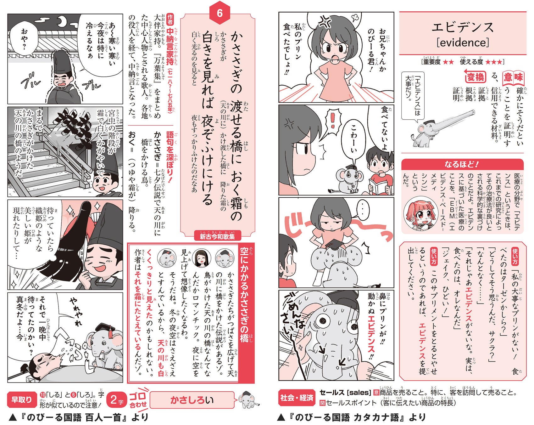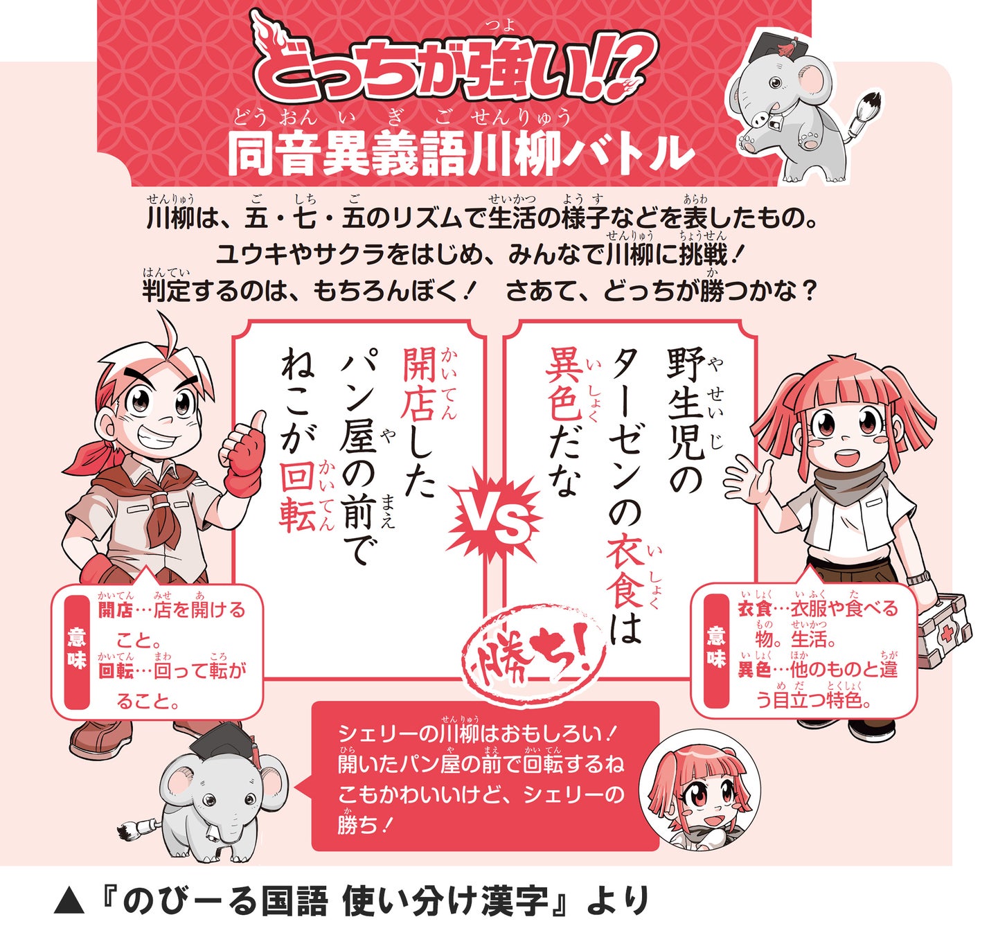 「のびーる国語」は、これまで『ことわざ』『四字熟語』『慣用句』の3冊が刊行されており、小学生に人気の「どっちが強い!?」シリーズのキャラクターが登場するストーリーまんがと、爆笑必至の4コマまんがで楽しく語彙を増やせるシリーズです。またイメージを膨らませやすい例文や、遊び要素のある読み物も充実しており、