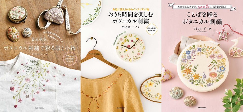 道端に咲く野草や、街路樹の花、花屋さんに並ぶ花…。日々の時間のなかで、目にする身近な花々を刺繍で描く『アトリエ ド ノラ』のながたにあいこさん。2022年3月に刊行した最新刊の『ことばを贈るボタニカル刺繍』をはじめ、インテリア小物を集めた『おうち時間を楽しむボタニカル刺繍』、季節ごとの花を服と小物に刺した『春夏秋冬。ボタニカル刺繍で彩る服と小物』、全3冊の著書はどれもAmazonなどで高評価が付き、版を重ねています。