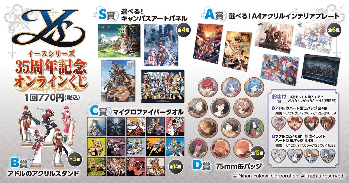 くじに含まれる商品は、「イース」シリーズのさまざまなビジュアルを用いたオリジナルグッズとなります。パッケージやエンディングイラストなど、シリーズの歴史が詰まったラインナップを揃えています。当然、あまりグッズ化されたことがない、貴重なイラストも多々あります! また、期間中に“リツイートキャンペーン”として、くじ引き堂のTwitter公式アカウントをフォロー&リツイートすると、抽選で2名様に「D賞 75mm缶バッジセット」をプレゼント!! この機会をお見逃しなく!