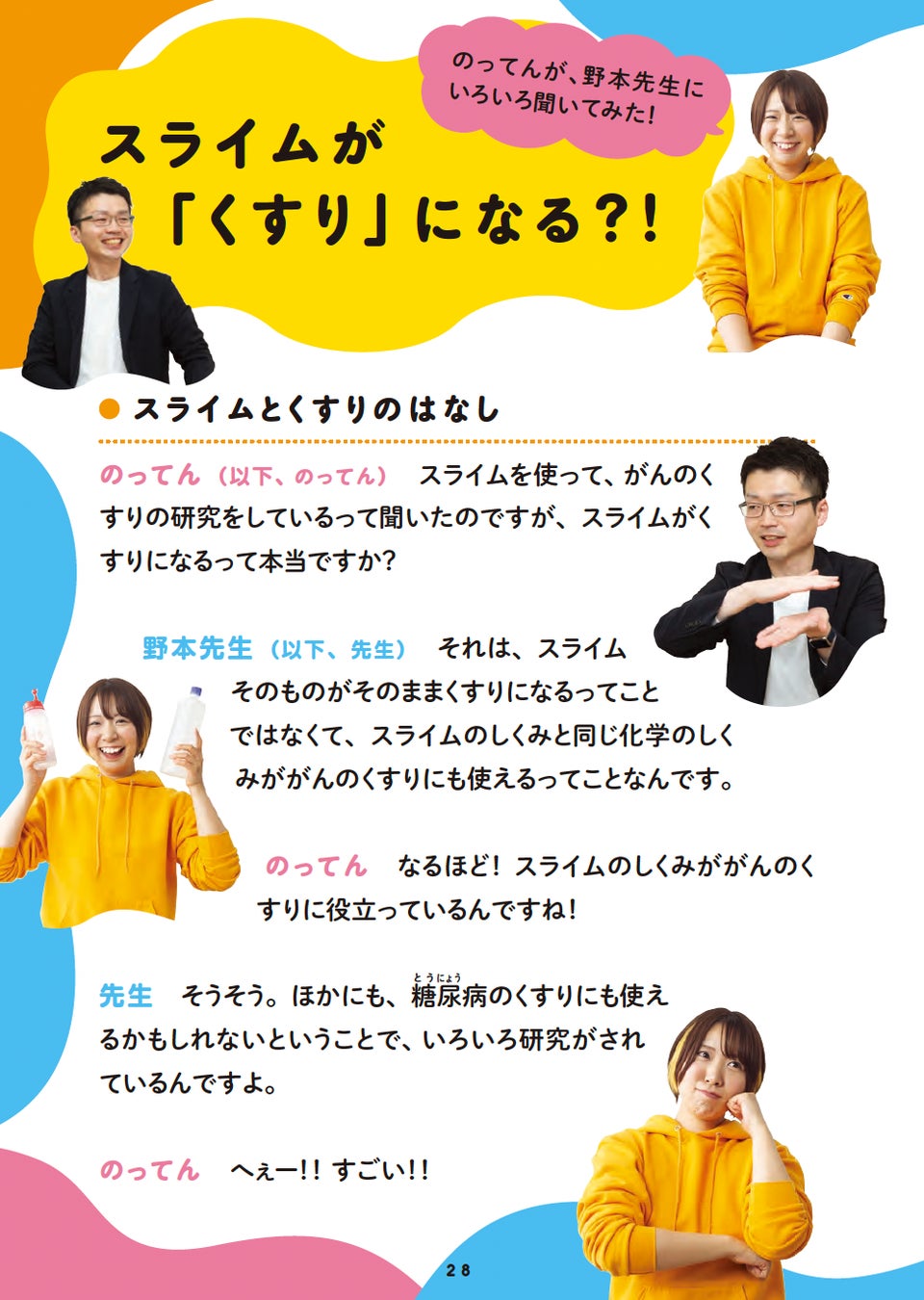 監修には、スライムの化学でがん治療薬を研究する東京工業大学助教授の野本貴大先生をむかえ、スライムの仕組みや著者ののってんと野本先生の「スライム対談」も実現。