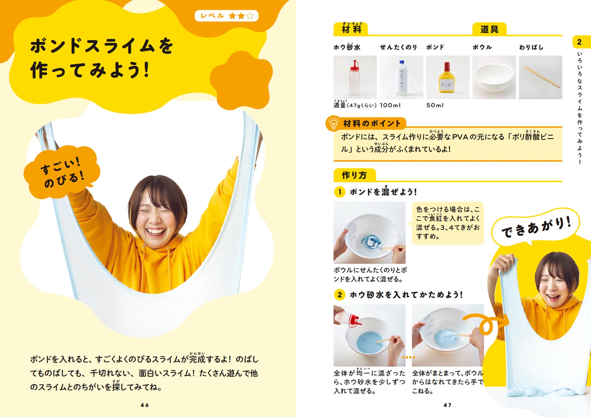 さまざまなスライムの作り方が写真つきでたっぷり掲載されています。