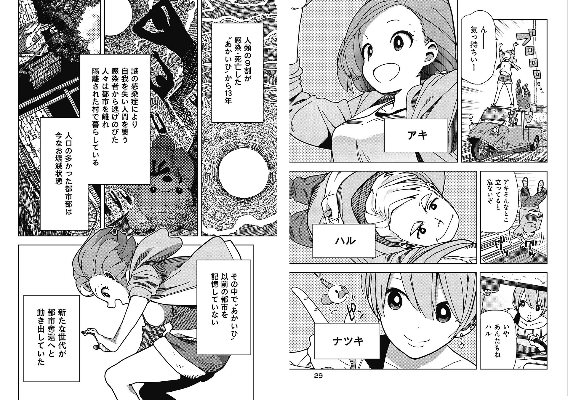 壊滅前の世界を記憶していない新世代のアキはかつて村を出て行った父親を捜すため、仲の良いハル、ナツキと共に村を抜け出す。