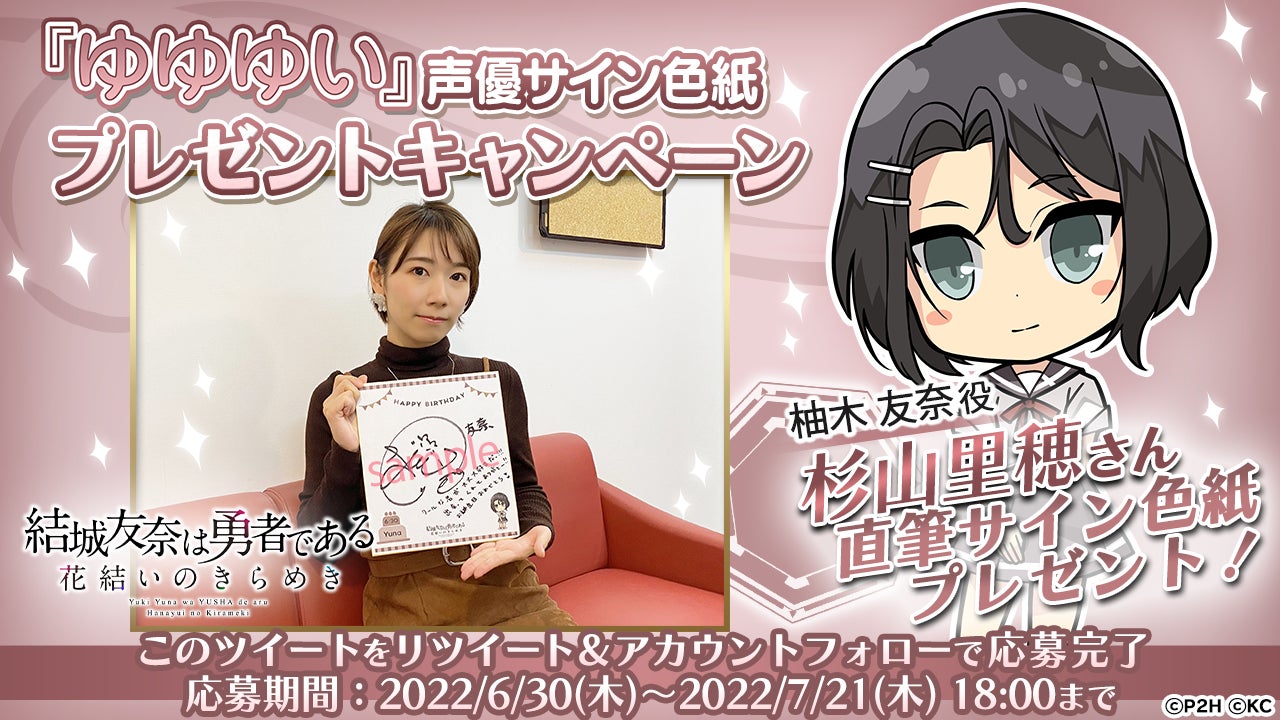 『ゆゆゆい』公式Twitterをフォロー&該当ツイートをリツイートすることで、柚木友奈役の杉山里穂さんサイン色紙プレゼントへの応募が出来ます。