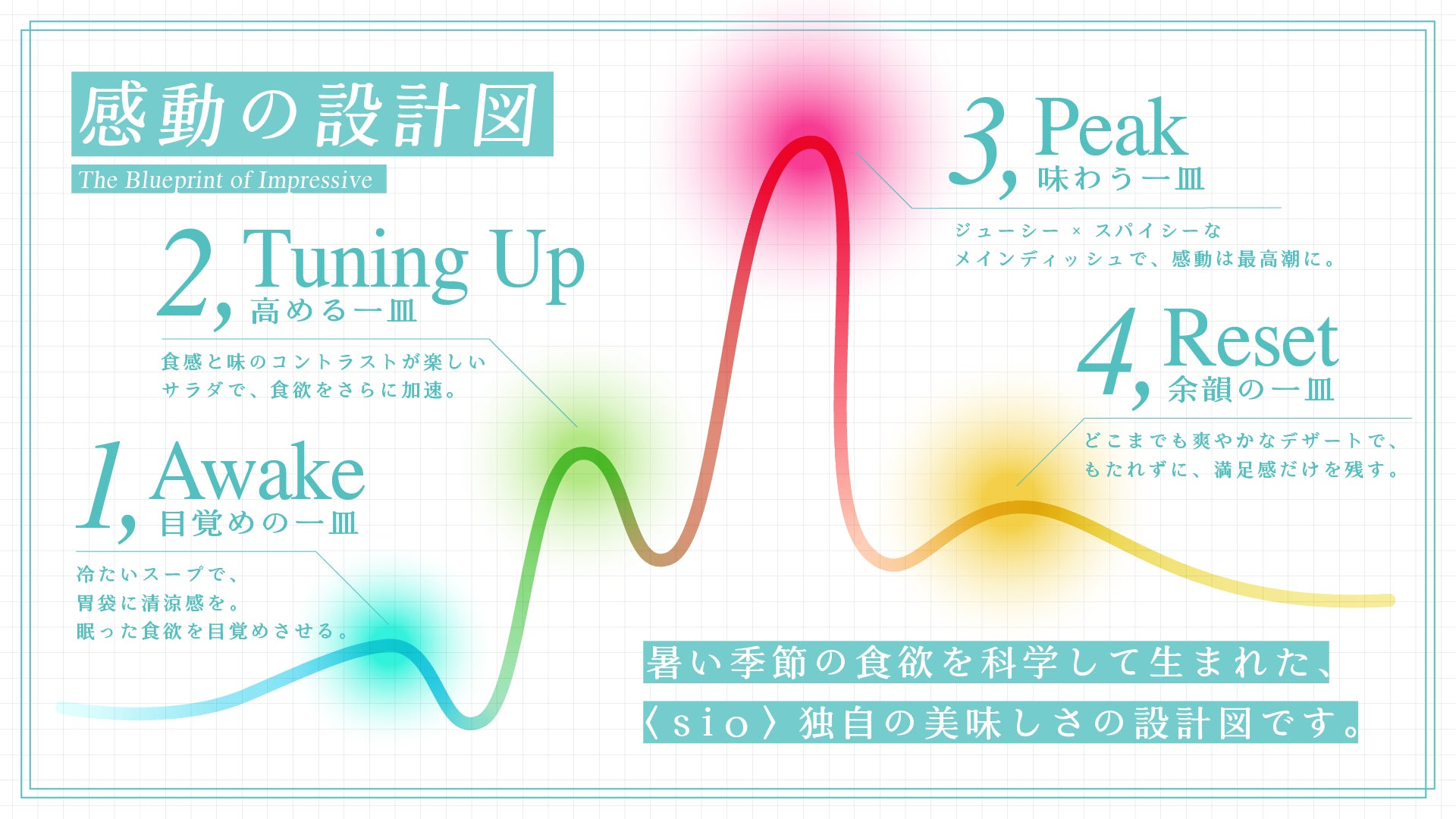 暑い季節の食欲を科学して生まれた、コース料理向けの独自の設計図。1品目は眠った食欲を目覚めさせる「目覚めの一皿」、2品目は食感と味のコントラストが楽しいサラダを通して食欲をさらに加速させる「高める一皿」、3品目はジューシー×スパイシーなメインディッシュで、感動を最高潮にする「味わう一皿」、そして4品目はどこまでも爽やかなデザートで、もたれずに満足感だけを残す「余韻の一皿」で構成されています。