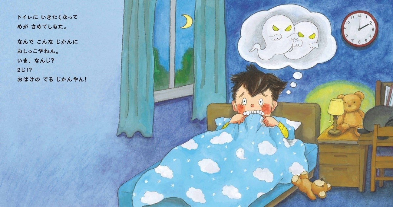 トイレに行きたくて、夜中に目が覚めたことはありませんか? 本作は、「夜にトイレに行くのがこわい」「おばけが出たらどうしよう」という不安に寄り添いながら、子どもたちに勇気と自信をあたえてくれるユーモア絵本です。
