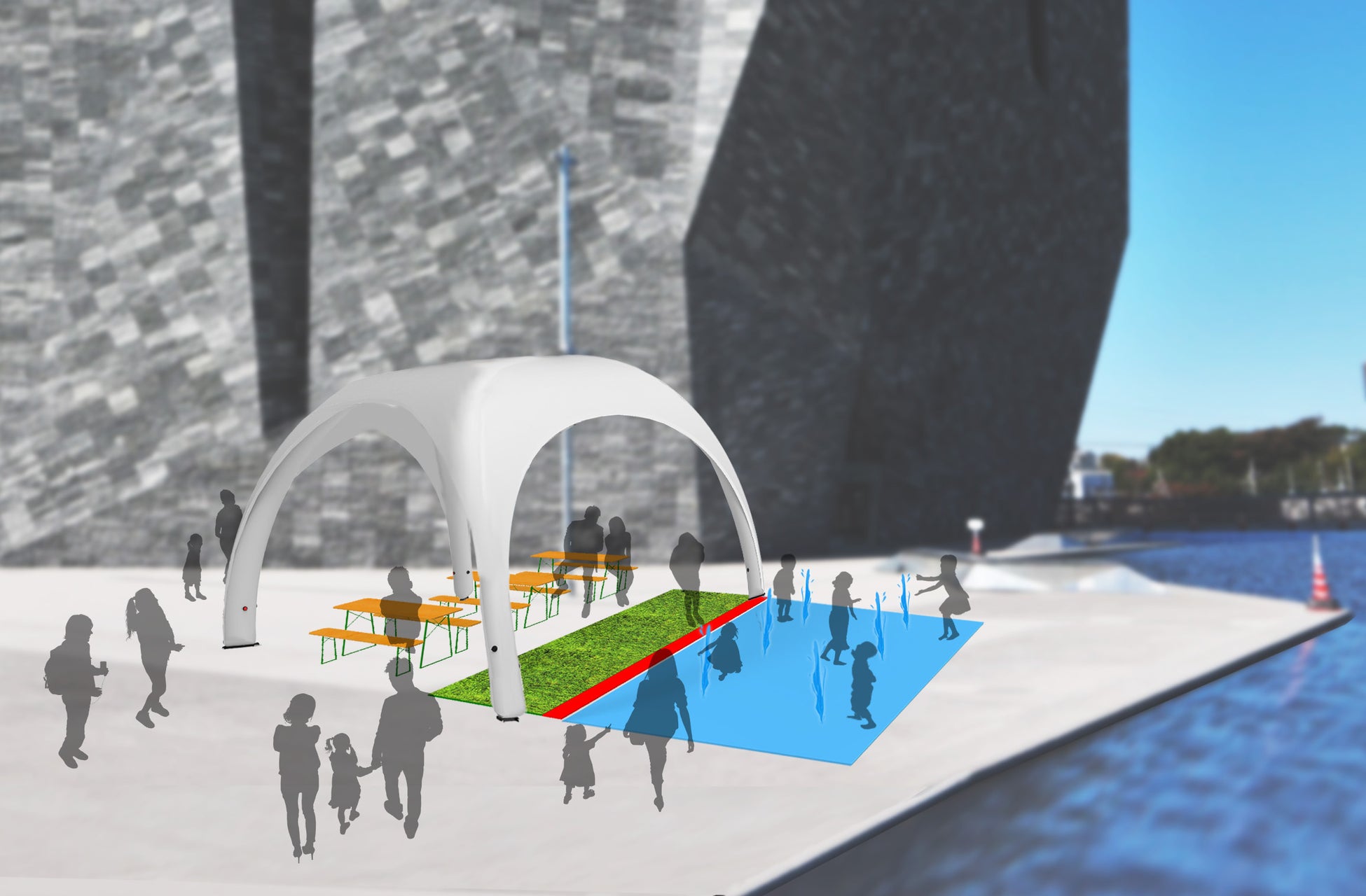 また、7月23日(土)~8月31日(水)の期間限定で、中央広場に「噴水広場」を設営します。高さ約1mの噴水が涼しさを演出し、お子様の水遊びスポットとしてお楽しみいただけるのはもちろん、施設の暑熱環境の改善や、体感温度を下げる効果も期待されます。