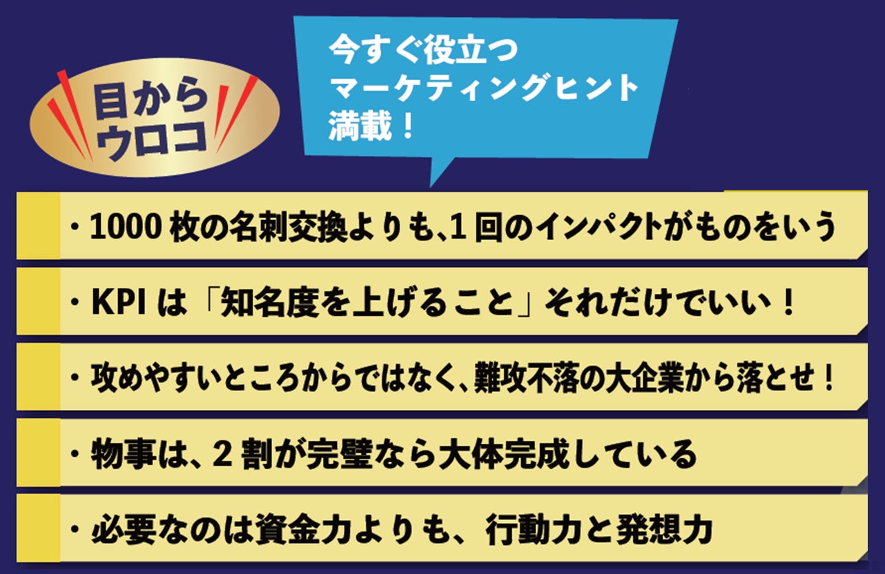 強烈なインパクトで一気に知名度を高め、最短で結果を出し続けた「マーケティングの天才」と呼ばれる西村社長による今までにない実践型マーケティング論を伝授します。