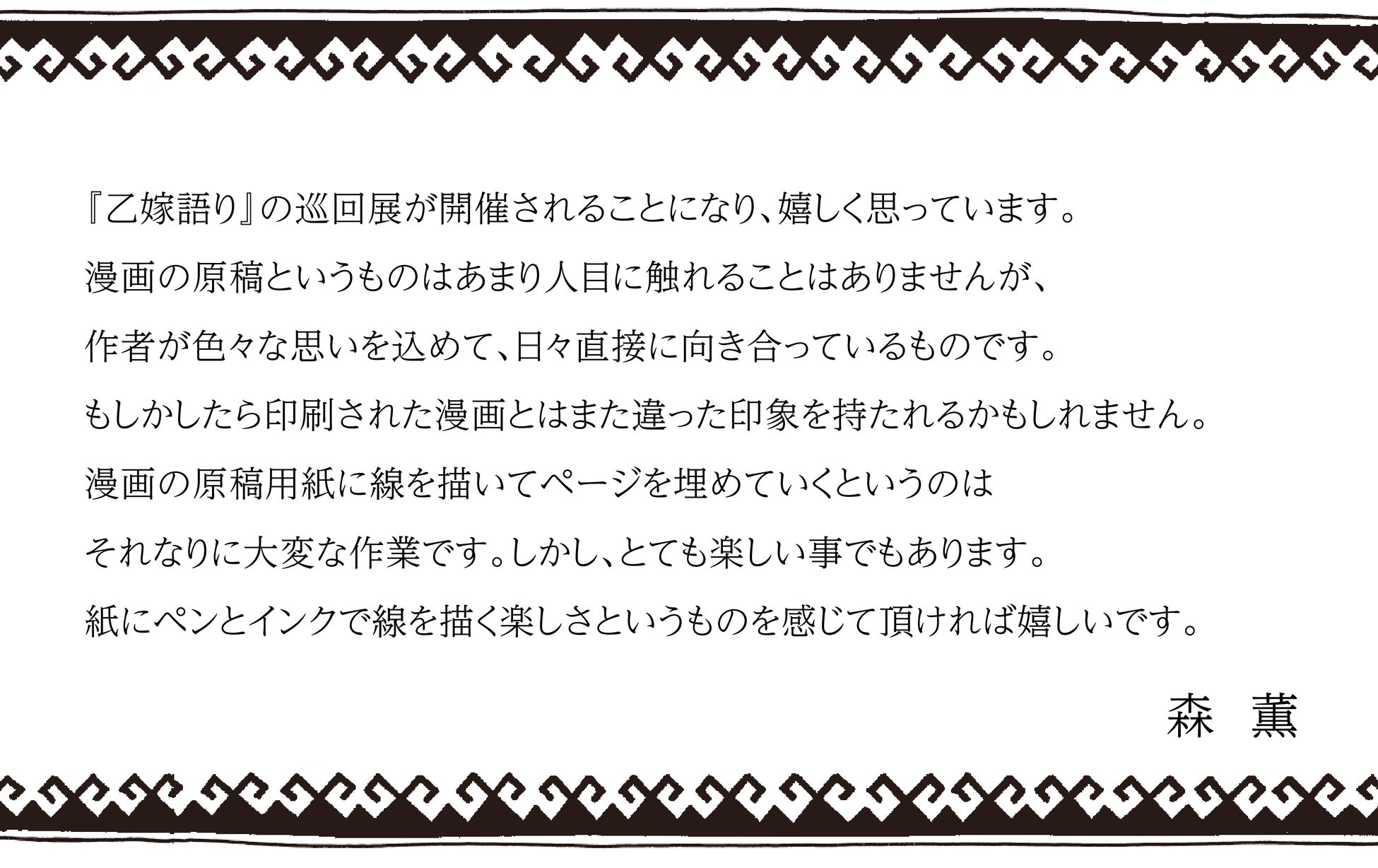 【『大乙嫁語り展』イベント公式ホームページ】https://tokorozawa-sakuratown.com/special/otoyometen/【巡回展の開催決定について、森薫先生よりコメントをいただきました!】