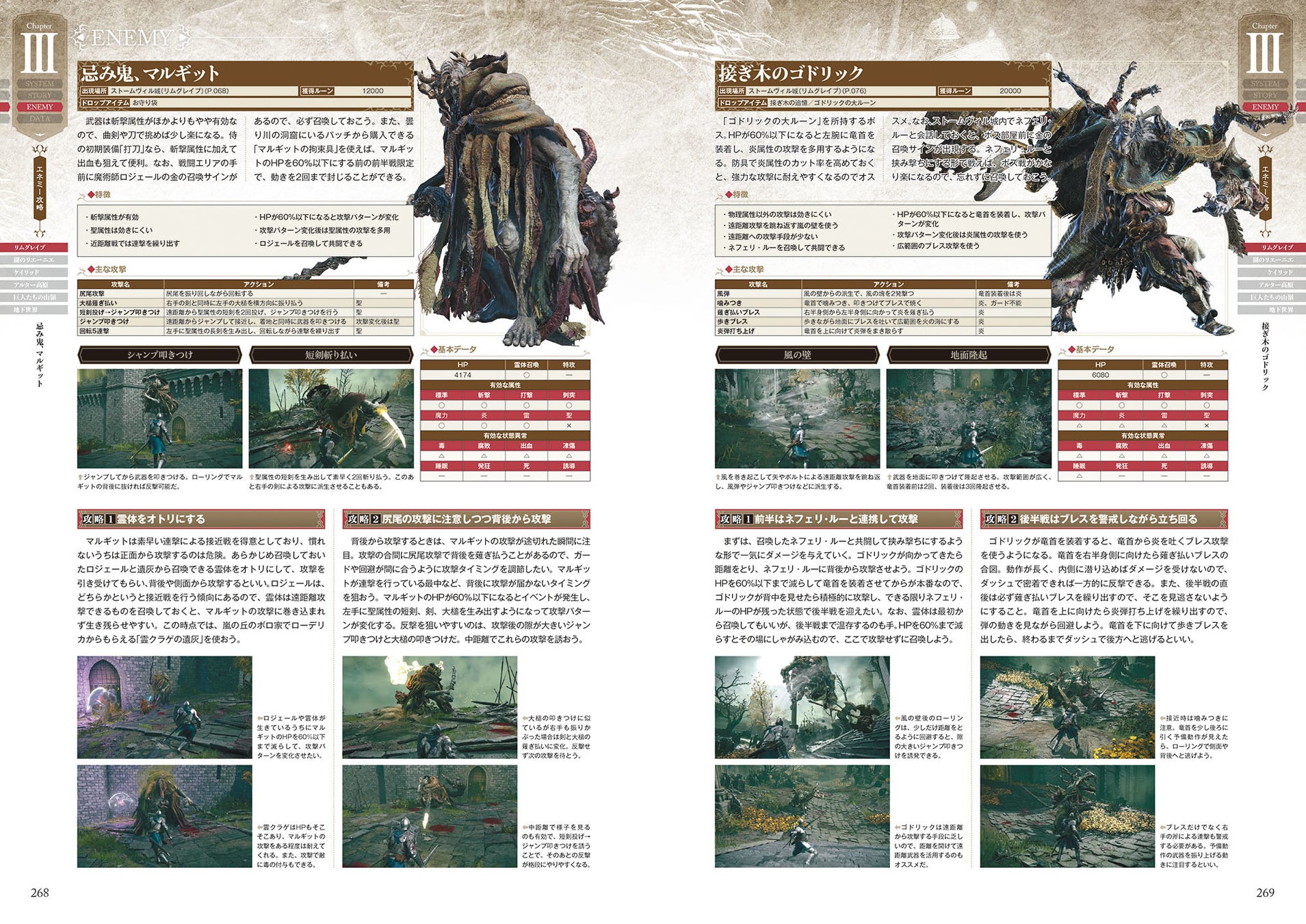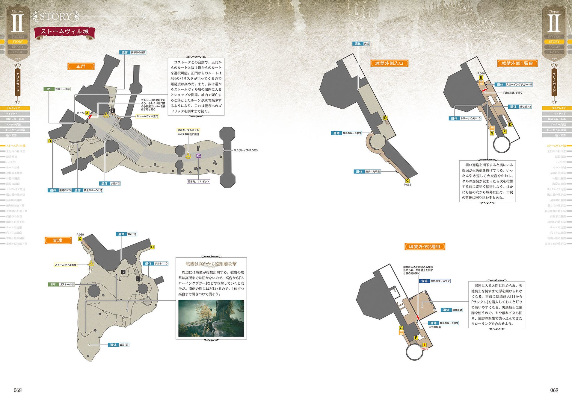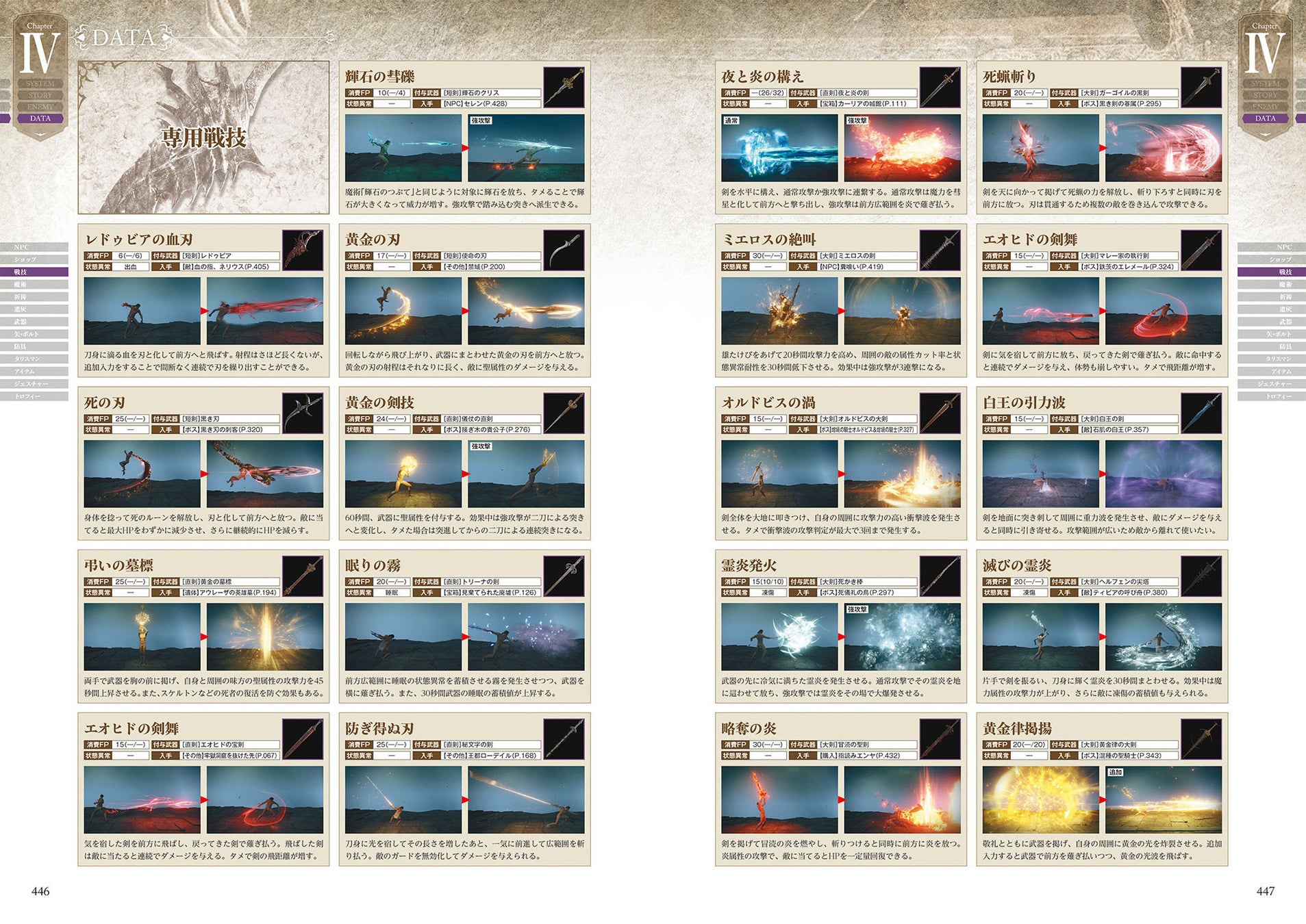 NPCイベント、ショップ、戦技、魔術、祈祷、遺灰、武器、防具、タリスマン、アイテム、ジェスチャー、トロフィーといったあらゆるデータを収録。また、装備品やアイテムの入手方法も網羅しています。