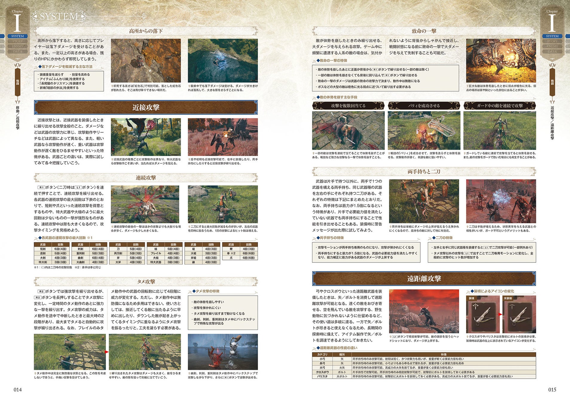 キャラクターの作成、ステータス画面の見方といった基本的な情報とレベルアップや武器の強化の仕組み、各アクションの詳細、聖杯瓶や霊薬の効果など、本作における基礎知識を詳しく解説しています。
