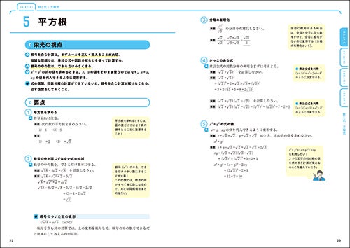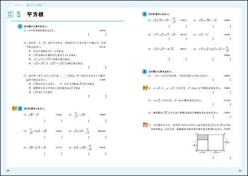 一般的なカリキュラム順に沿って、テーマごとに要点+練習問題のセットを掲載しています。要点で基礎をおさらいしたら、練習問題で理解度をチェック。練習問題は、全国の公立高校入試問題からおもに出題しています。スピーディにおさらいをしながら、過去問で実践演習をつむことができます。過去問は、標準的な問題を中心に掲載しており、合格点をとるための基盤を固められる構成になっています。
