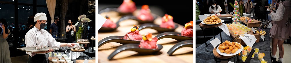 イベントを手掛けたメンバーとショーの来場客が交流する場として開催したアフターパーティーでは、キンプトン新宿東京 エグゼクティブシェフ・トーマスの監修のもと、レコールバンタンのメンバーがフード、スイーツとドリンクを考案。ショーと同様に「PEACE」をテーマとし、世界の連帯と平和の象徴をイメージした5色のフードや、虹色のスイーツなどを提供しました。
