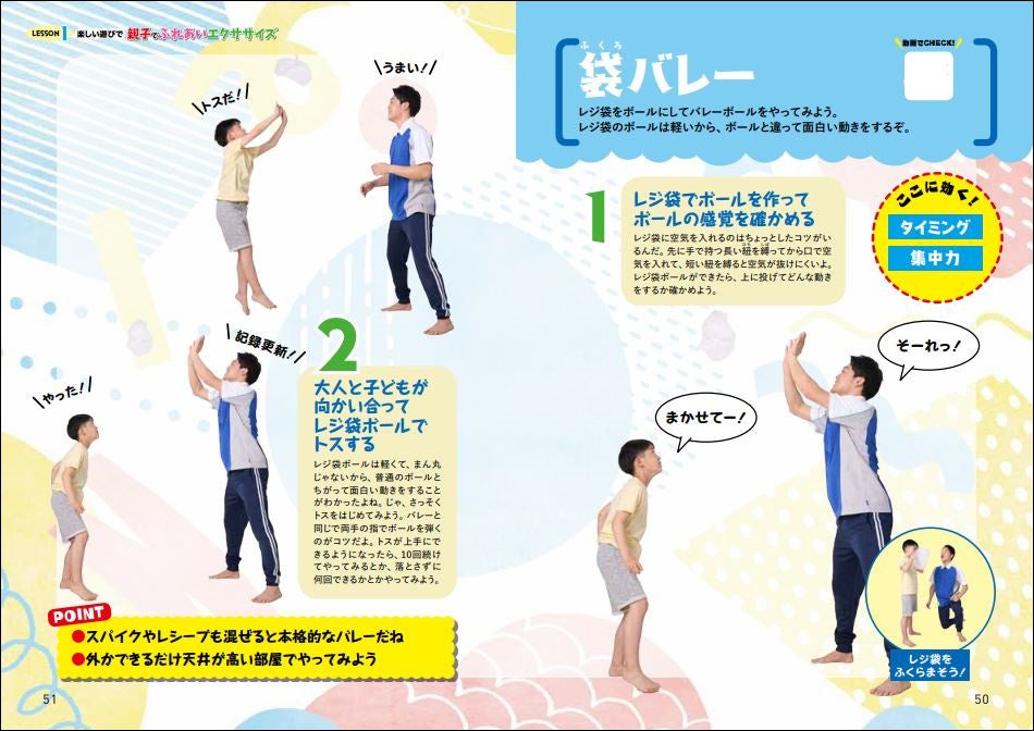 スーパーの袋を使った遊びや、体を動かすリズムゲーム、反射神経を鍛える運動をご紹介。「しりとりバレー」「牛と馬」「ふんじゃダメよ」「つなげて動いて」etc...、メニュー名からやってみたくなる運動をたっぷりご紹介。