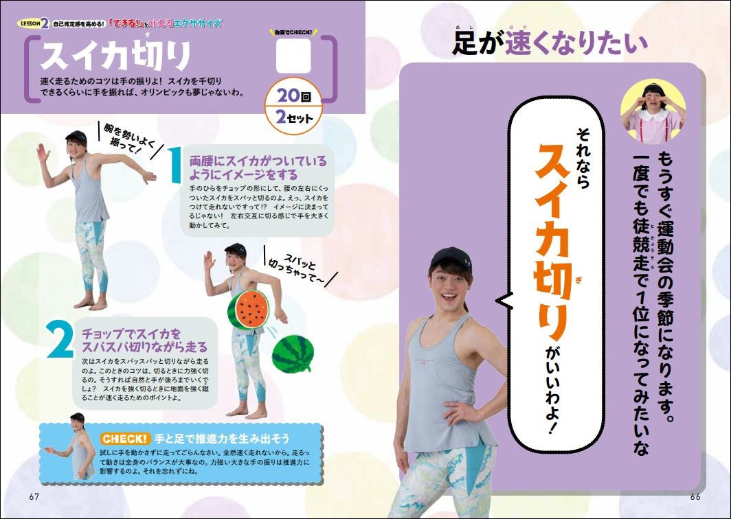 猫背をなおしたい、足が速くなりたい、体をやわらかくしたい、よく眠れるようになりたい、ジャンプ力をつけたい、バランス感覚を身につけたいetc...。子どもや大人のあるある!な願望を、おばたのお兄さんがフィットネストレーナー風のキャラになりきって楽しくレクチャー。