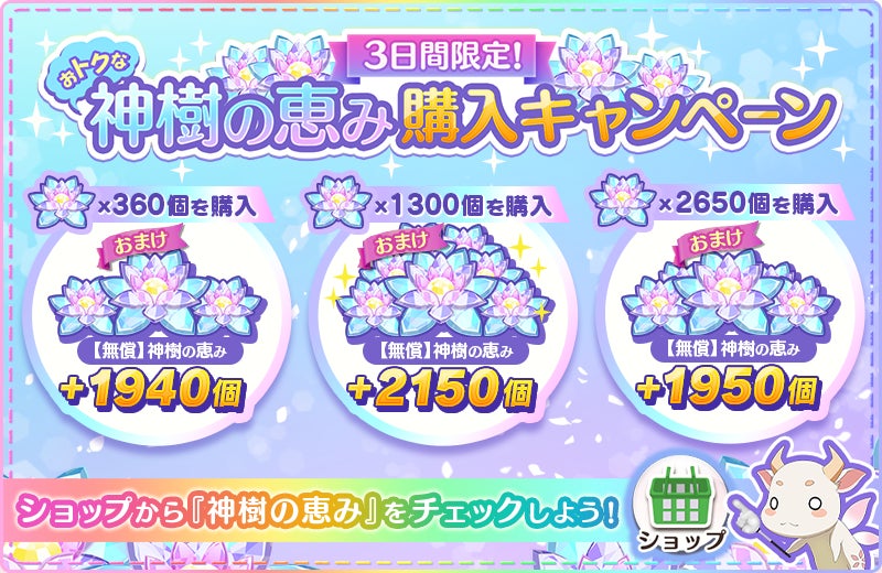 期間中、ショップに「神樹の恵み(無償)」のおまけ付き「神樹の恵み(有償)」のアイテムが追加されます。