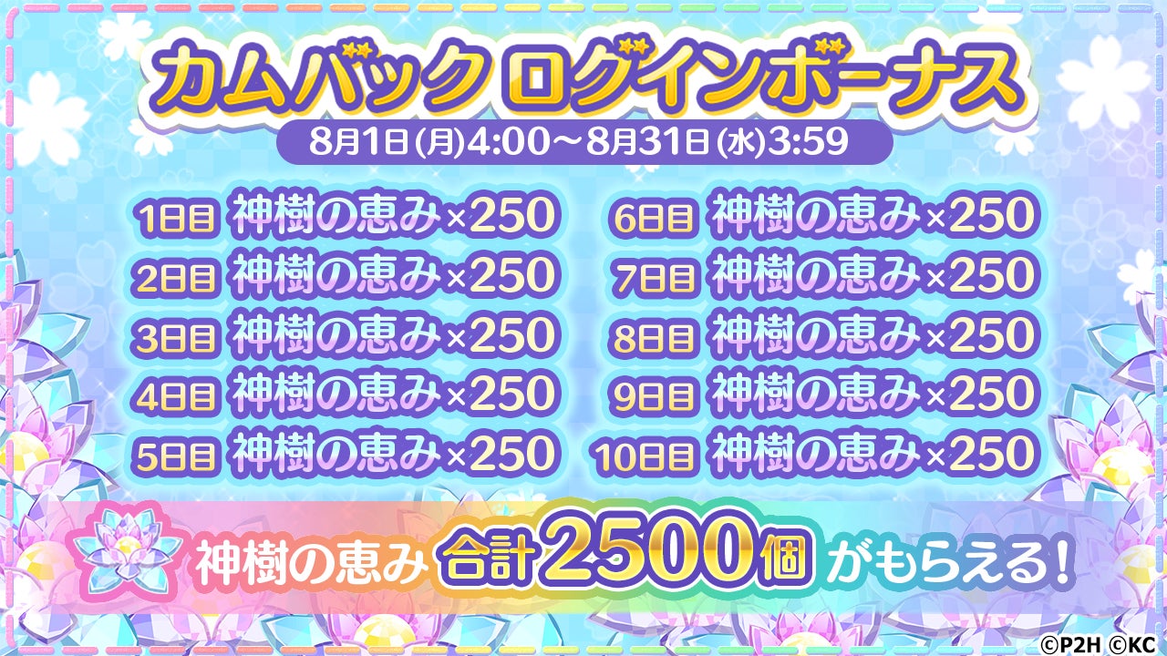 期間中にログインすると神樹の恵みが合計2500個もらえます。