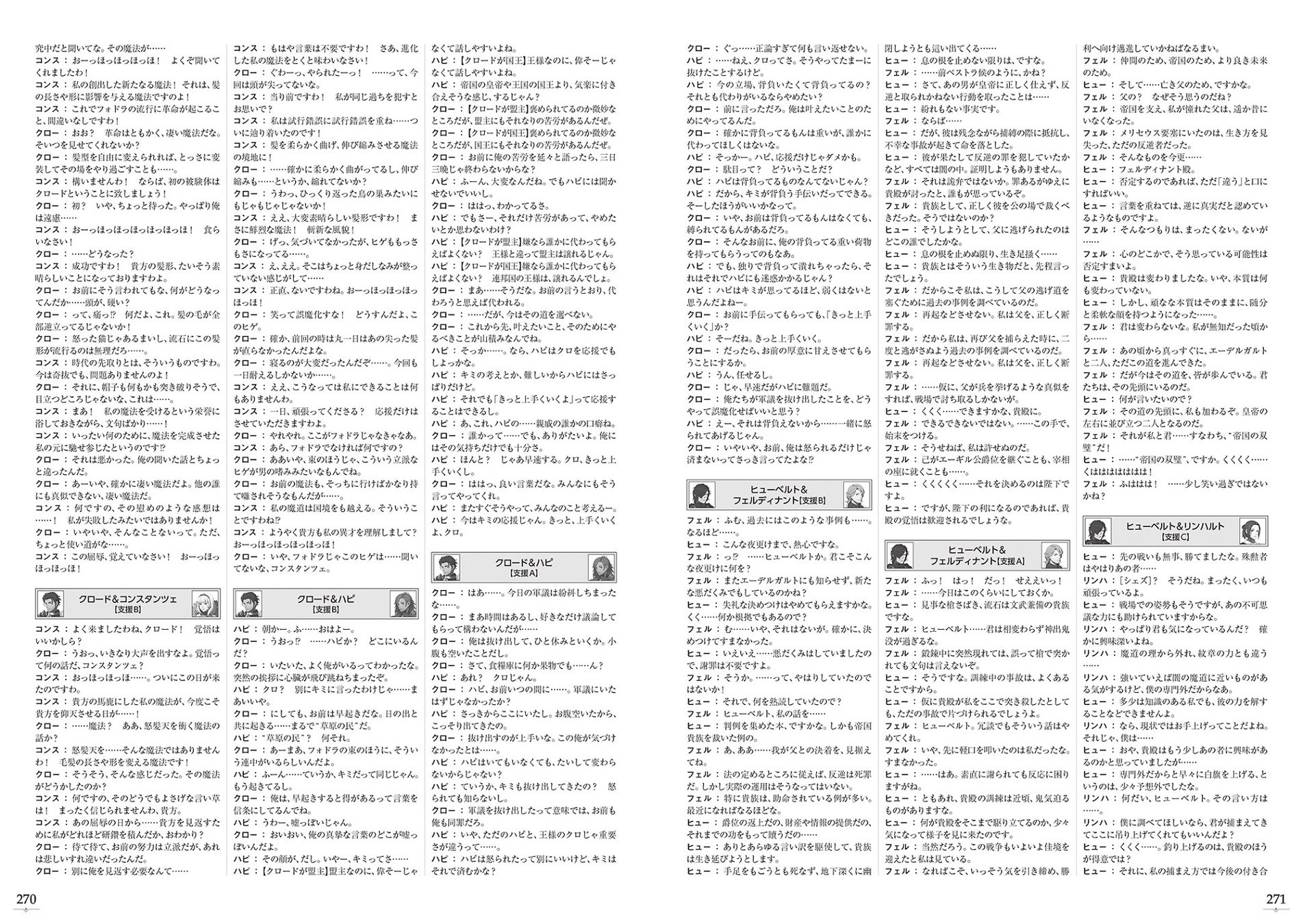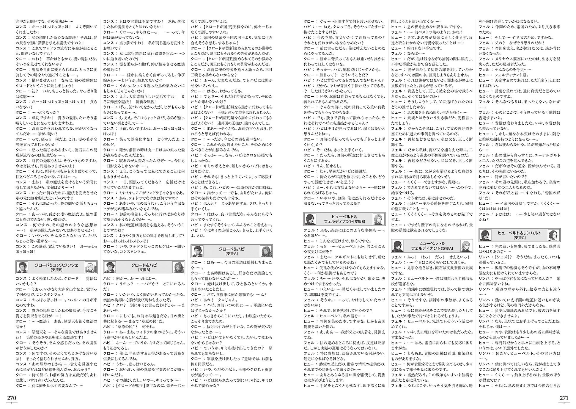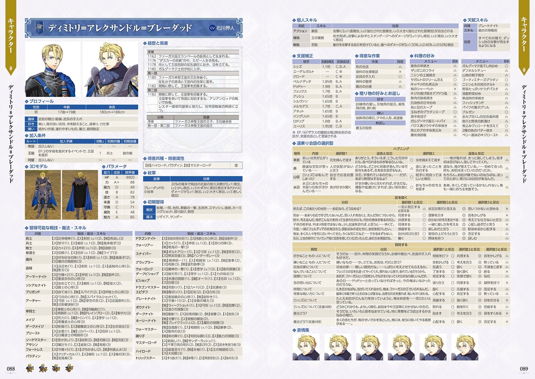 キャラクター間の絆を深めると発生する支援会話について、すべての組み合わせのテキストを網羅。拠点や戦闘時のボイス集に、交流や訓練時の各種会話のテキストも収録。