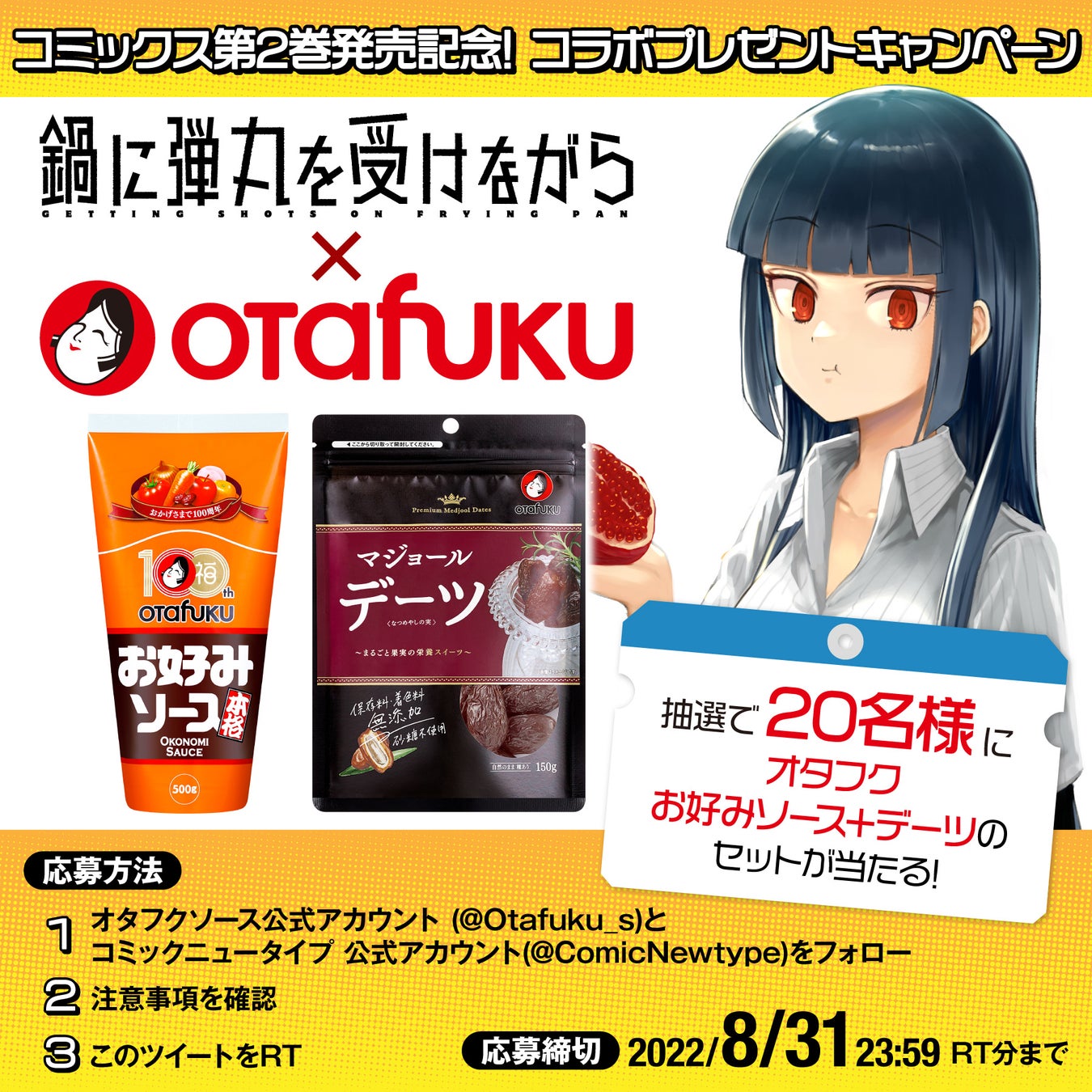 Twitterの「オタフクソース」公式アカウントと「コミックニュータイプ編集部」公式アカウントの両方をフォロー&キャンペーンツイートをリツイート(RT)していただいた方の中から、抽選で20名様にオタフク お好みソースとデーツのセットをプレゼントいたします!