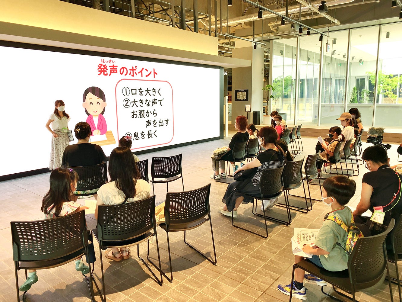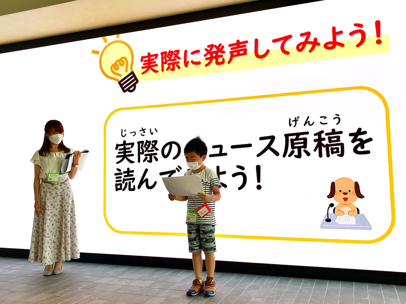 子どもたちは、声の出し方やポイントについて、早口言葉などを交えながら楽しくレクチャーをしてもらった後、実際のニュース原稿を使ったアナウンス体験にチャレンジ。