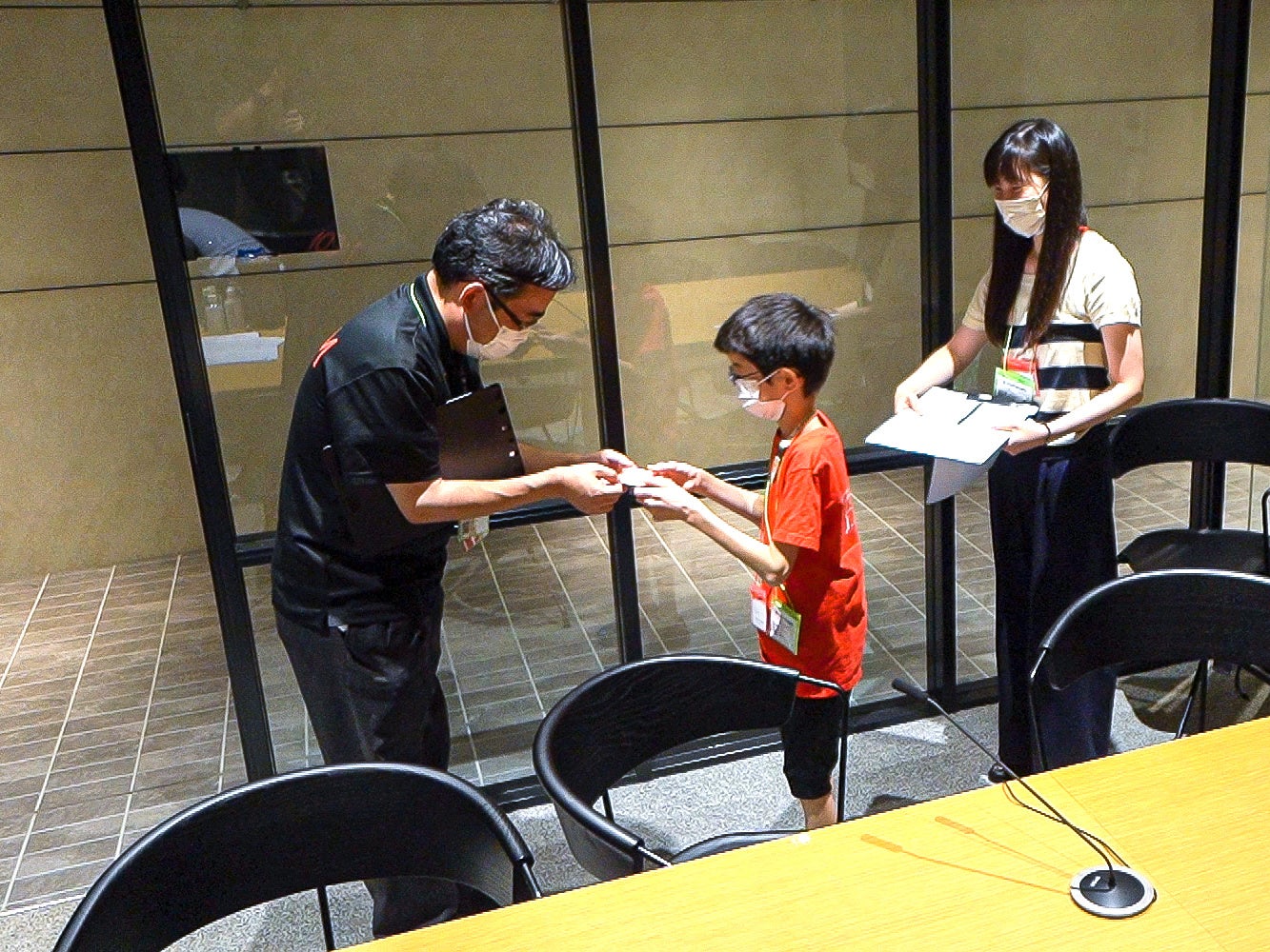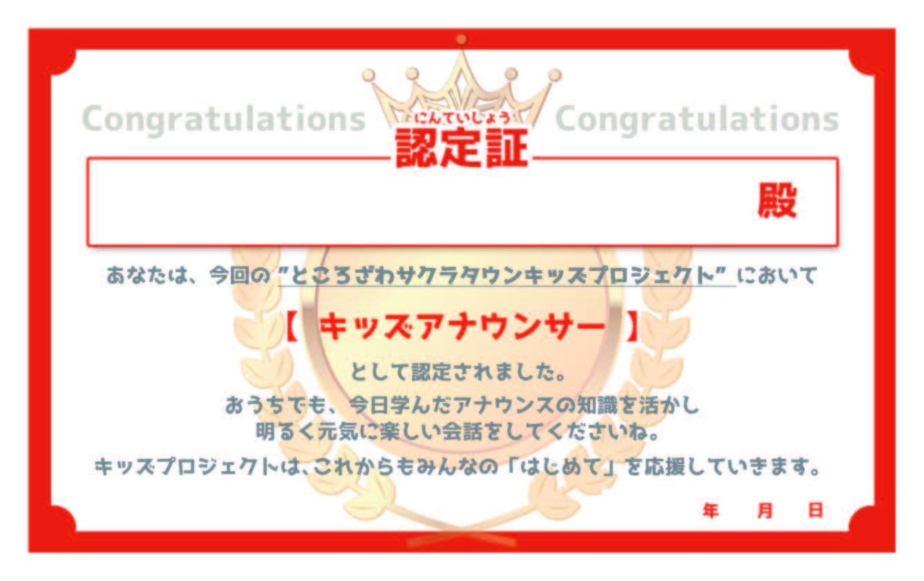 収録後、参加してくれた子どもたちには、学びの記念として、JCOM株式会社 映像制作第一部の中井尚也さんから「キッズアナウンサー認定証」が授与されました。録音をやりとげた子どもたちは皆、笑顔で受け取っていました。