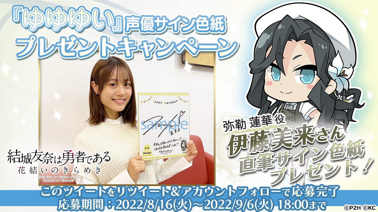 『ゆゆゆい』公式Twitterをフォロー&該当ツイートをリツイートすることで、弥勒蓮華役の伊藤 美来さんサイン色紙プレゼントへの応募ができます。