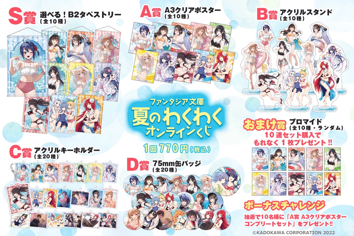 商品は、ファンタジア文庫人気作品の「水着」をテーマとした衣装に身を包んだヒロインの描き下ろしイラストを多数使用したオリジナルグッズとなります。