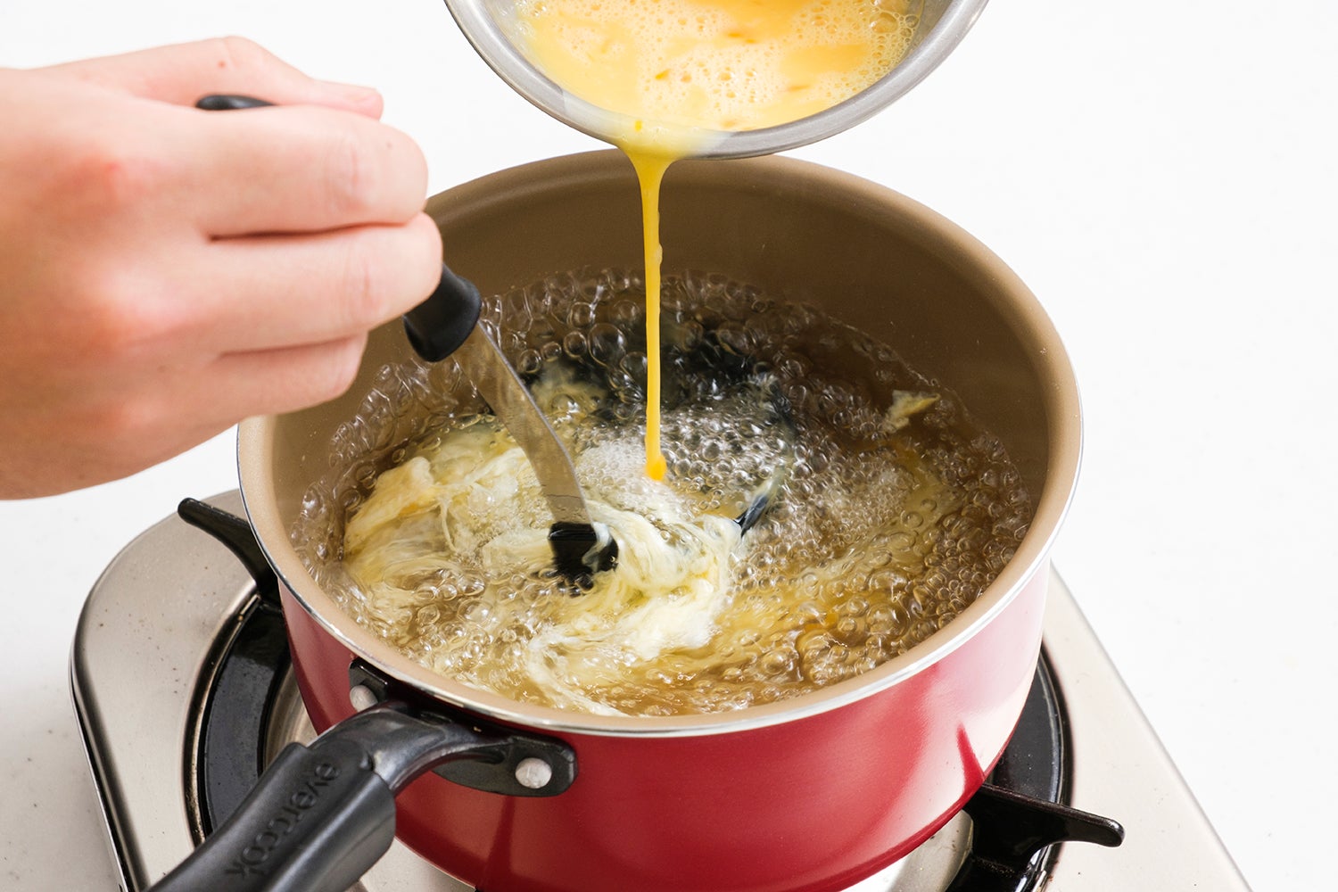 スープが煮立った状態に、温度が下がらないよう1/3量ずつ卵を加えると、一瞬で火が入り、汁が濁りません。卵が均一に広がるよう、「鍋の中を混ぜながら」も大事です。