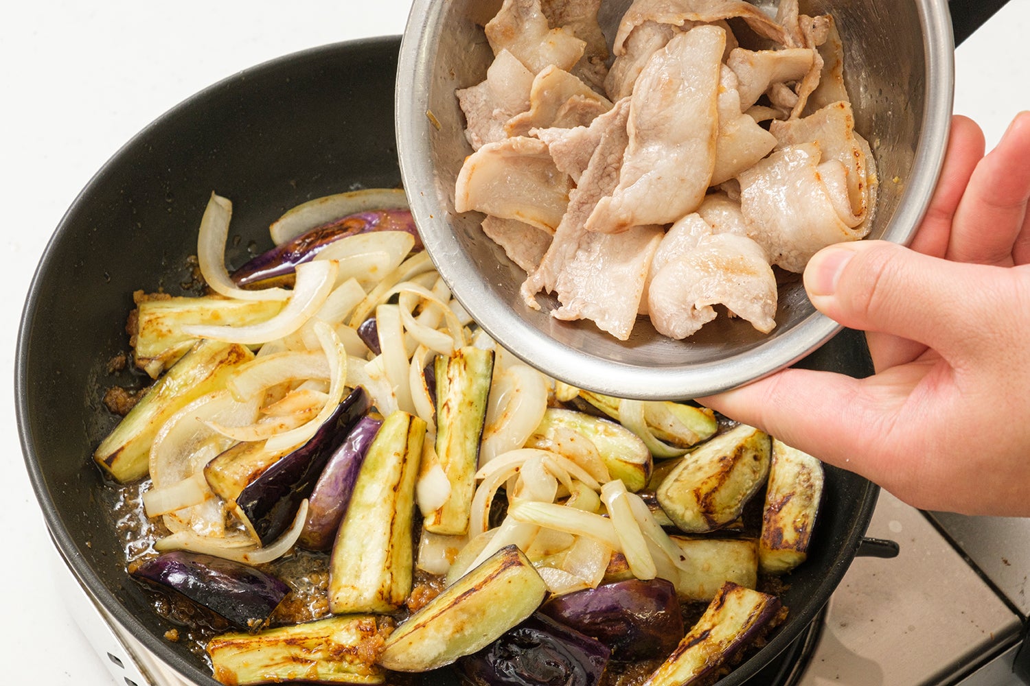 ●豚肉となすのスタミナ炒めは、食材を別々に炒めて合体!