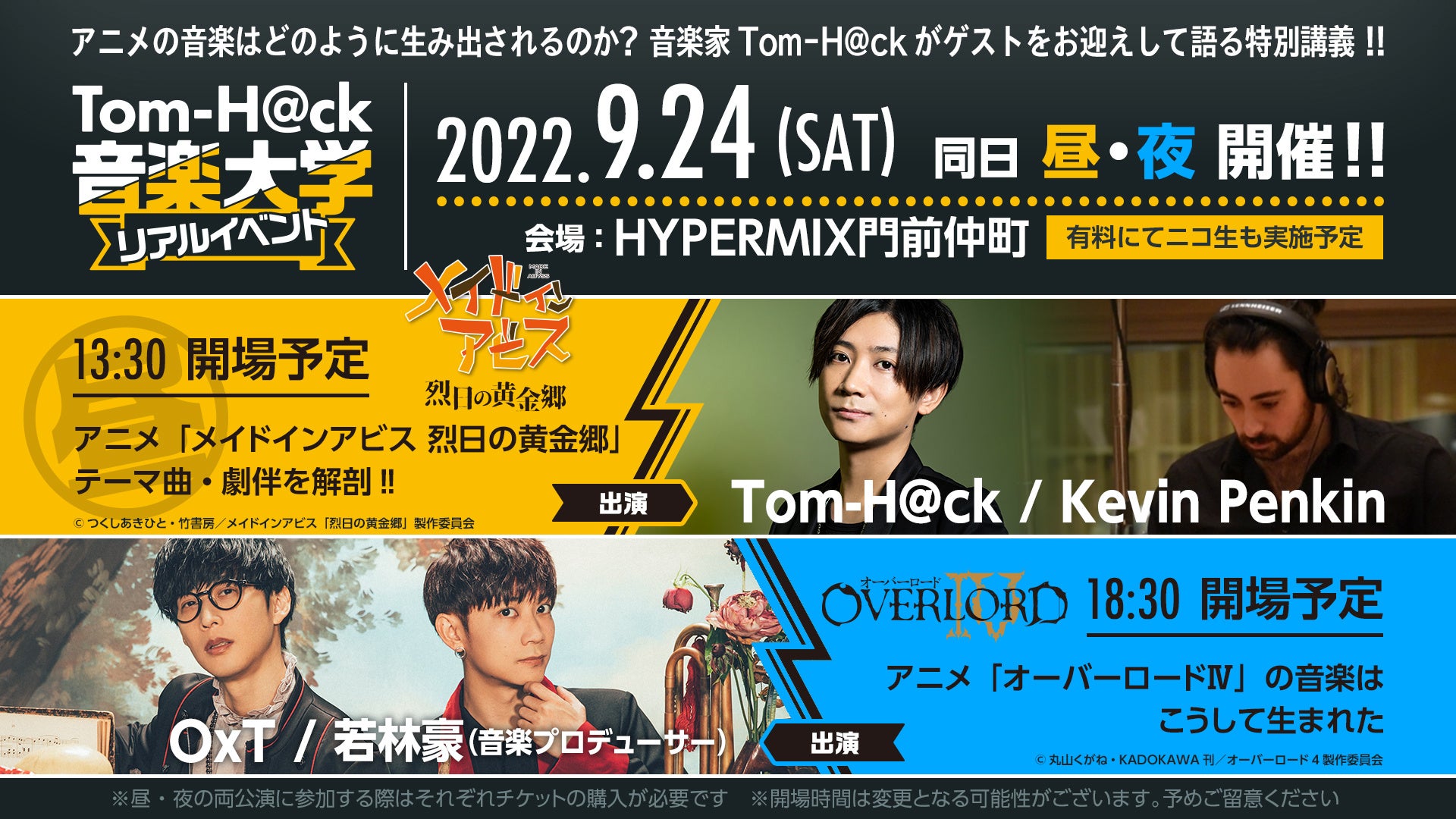 Tom-H@ckがお送りするニコニコチャンネル『Tom-H@ck音楽大学 -特進クラス-』が、ついにリアルイベントを開催!9月24日同日昼・夜の2部構成で、それぞれ人気アニメの音楽をテーマに、ゲストを迎えて語っていきます。今後音楽でアニメに関わっていきたいという方には必聴の内容となり、