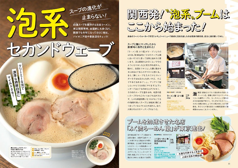 白湯スープをかくはんして生み出される泡系ラーメンは、ここ数年で全国的に拡がり、発祥地と言われる関西でもさらに増加を続けています。本特集では泡系ラーメンの元祖「ラーメン家 みつ葉」に聞いたその誕生秘話や、豚骨ベースやプレス式白湯、フレンチシェフの技ありの一杯など、注目を集める泡系ラーメンの全貌を徹底紹介します。