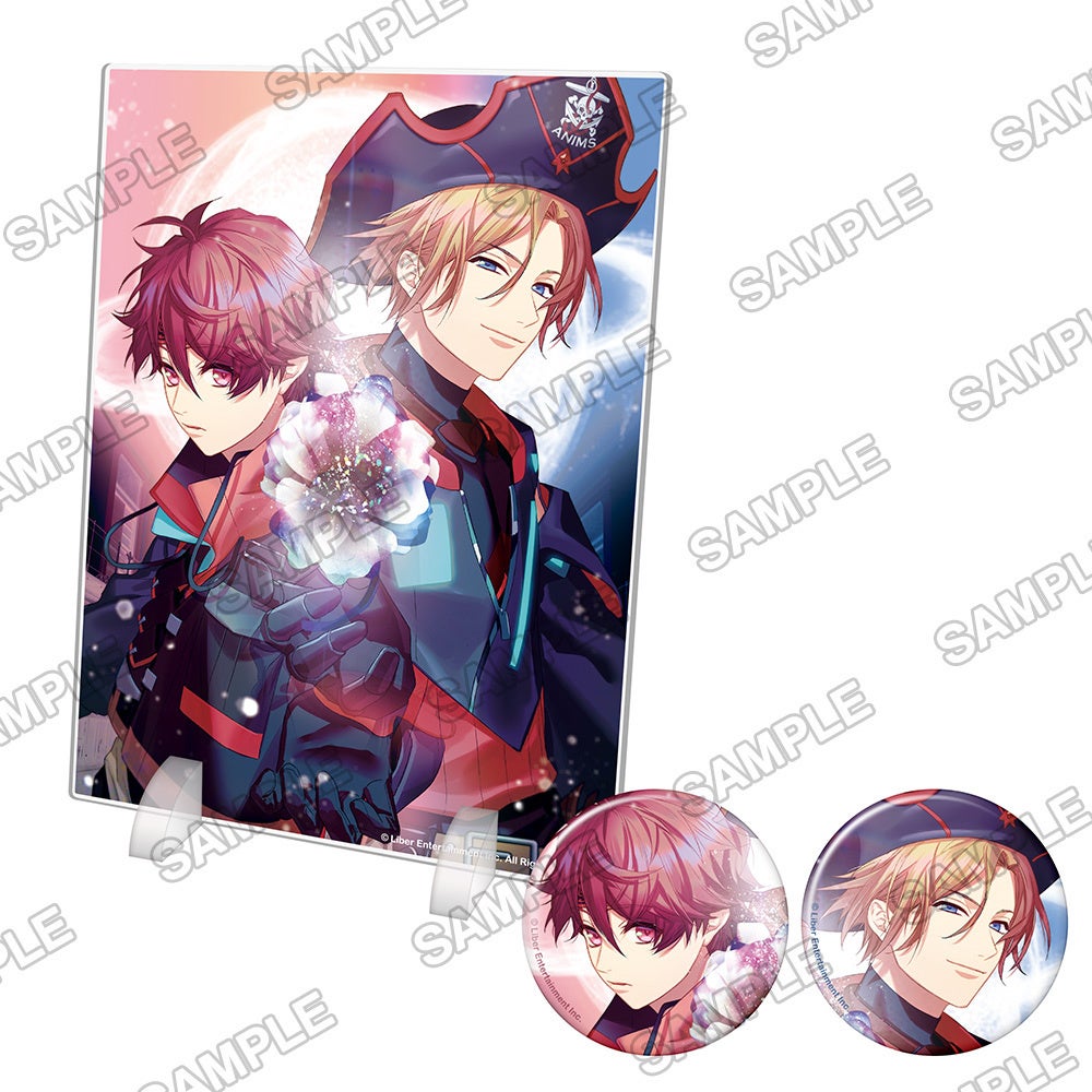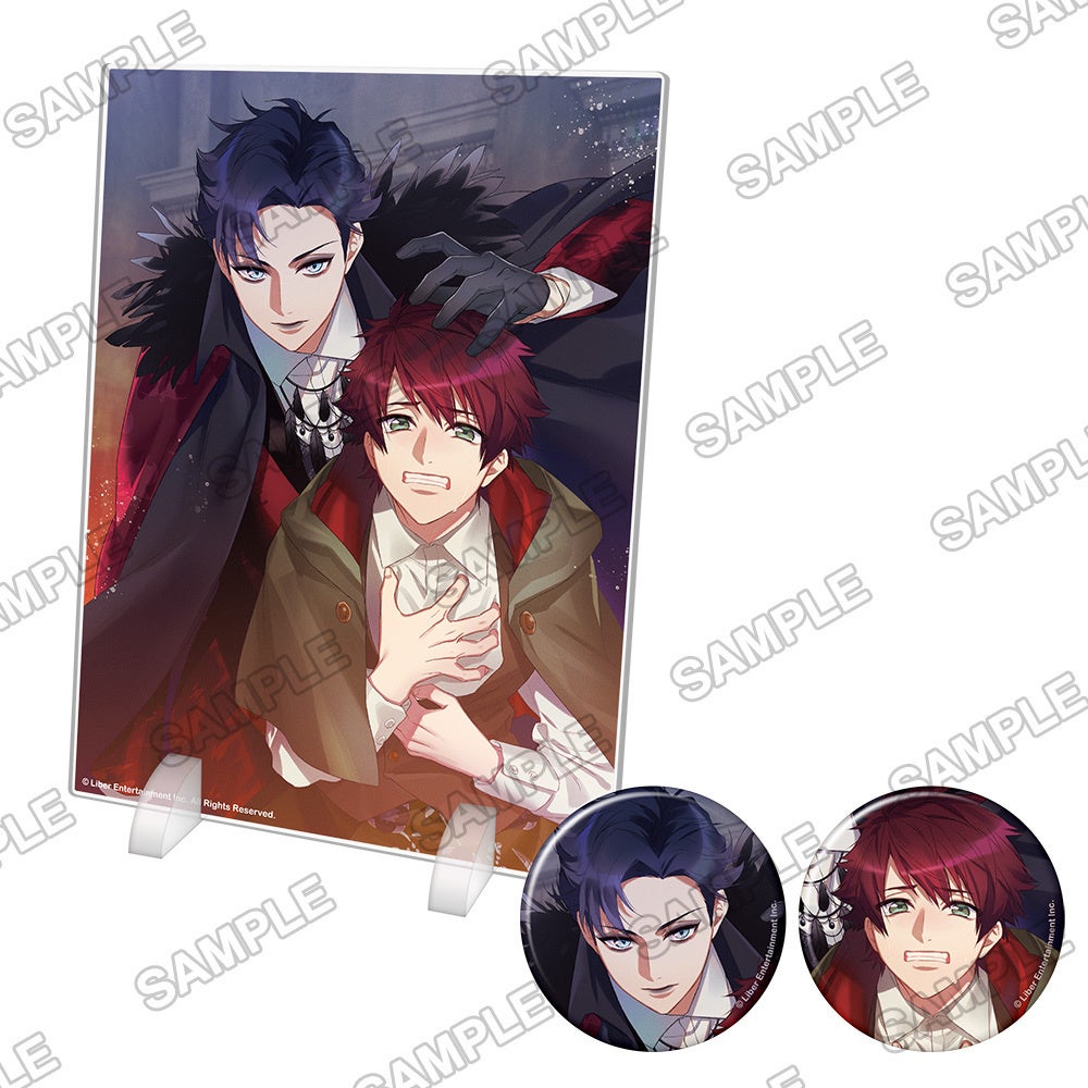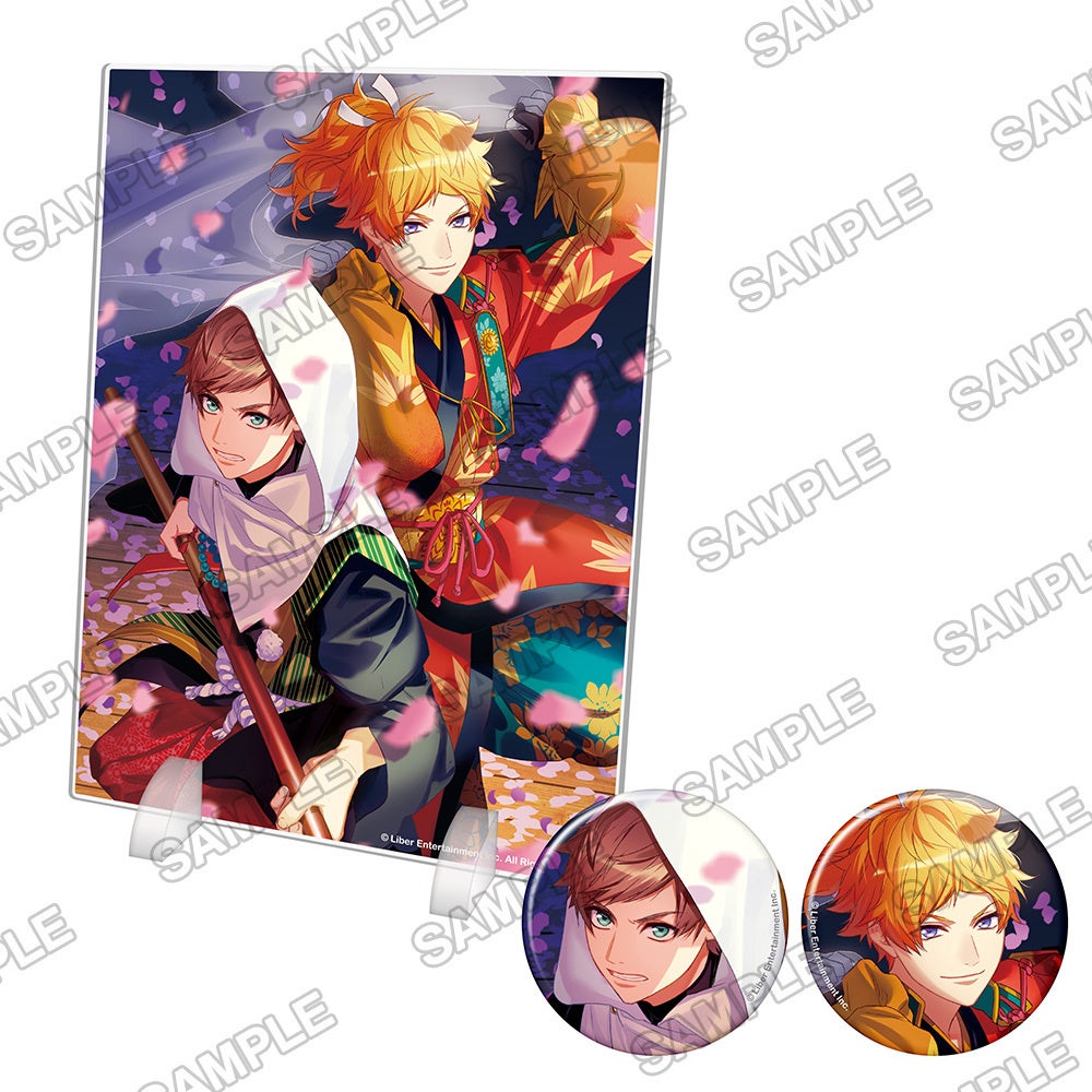 描き下ろしカバーイラストを使用した「佐久間咲也」「摂津万里」のアクリルパネル(約17cm×13cm)と缶バッジ2個(約57mm)がセットです。