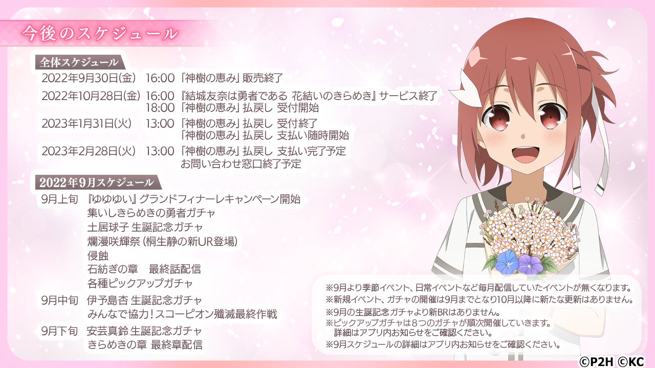 この度、『結城友奈は勇者である 花結いのきらめき』は、誠に勝手ながら2022年10月28日(金) 16:00をもちまして、サービスを終了させていただくこととなりました。