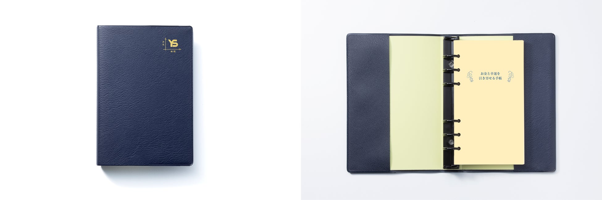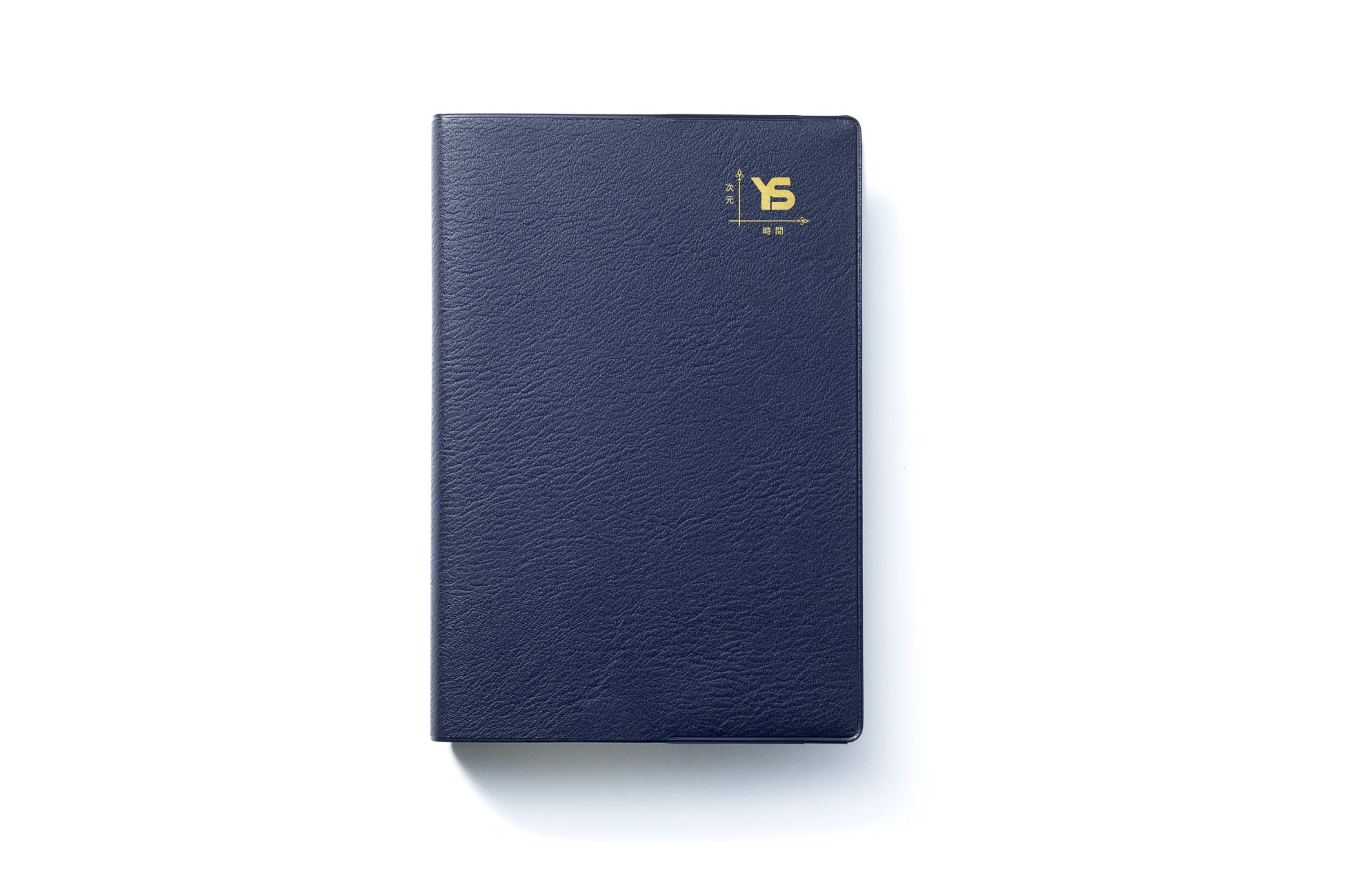 カバーは軽くて丈夫なネイビーのPVC素材に、金箔ロゴで「YS(Yasuyuki Sato)」マークと次元/時間軸を刻印。本文は使いやすいバイブルサイズのレフィルが使用できるシステム手帳です。バインダー式なので、6つ穴タイプの市販のメモなどを足しても便利に使えます。