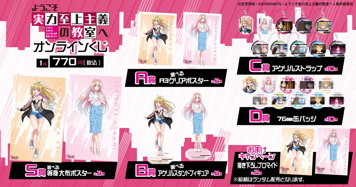 商品は軽井沢恵、一之瀬帆波の新規描き下ろしイラストを含むオリジナルグッズとなります。それぞれの魅力を描いた描き下ろしイラストの商品や、TVアニメの場面写真を使用した商品など豪華景品が盛りだくさん!!