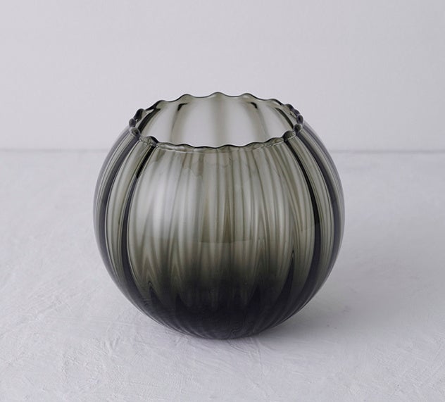香りのよいバラを贅沢に束ねたブーケにふだんの花飾りも素敵になるガラスの花器をセット。花器は人気メーカー、スガハラガラスの『パフ:モールボール花器(S)』。どんな花もおしゃれに決まるカーボンブラックの器です。