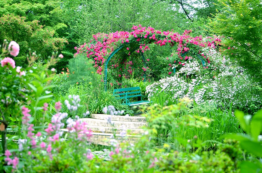 印象派の巨匠クロード・モネは、フランス・ジヴェルニーの庭を創造の源泉として「睡蓮」などの多くの名作を生み出しましたが、彼がこよなく愛したその庭をモデルに、北川村の「モネの庭」は創られています。色とりどりの睡蓮とゆらめく水面、太鼓橋や藤棚、バラのアーチなど、庭を散策するなかで、モネの描いた風景をかいまみることができます。北川村のまぶしい光と青い山海を背景に「花の庭」「水の庭」「ボルディゲラの庭」をゆったりと巡りながら絵画の世界観と四季折々の自然模様を堪能しましょう。