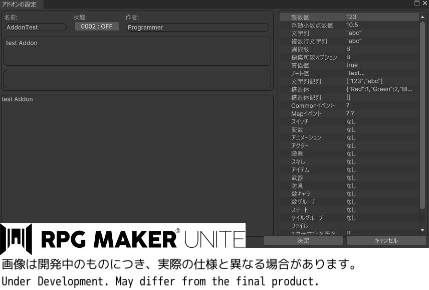 従来のRPG Makerのプラグインマネージャーのような仕様で、「一目瞭然で気軽に追加機能をオン / オフをできる方が親切だ」という声が多く頂いております。このため、プラグインマネージャーに該当する機能「アドオンマネージャー」を追加開発することになりました!
