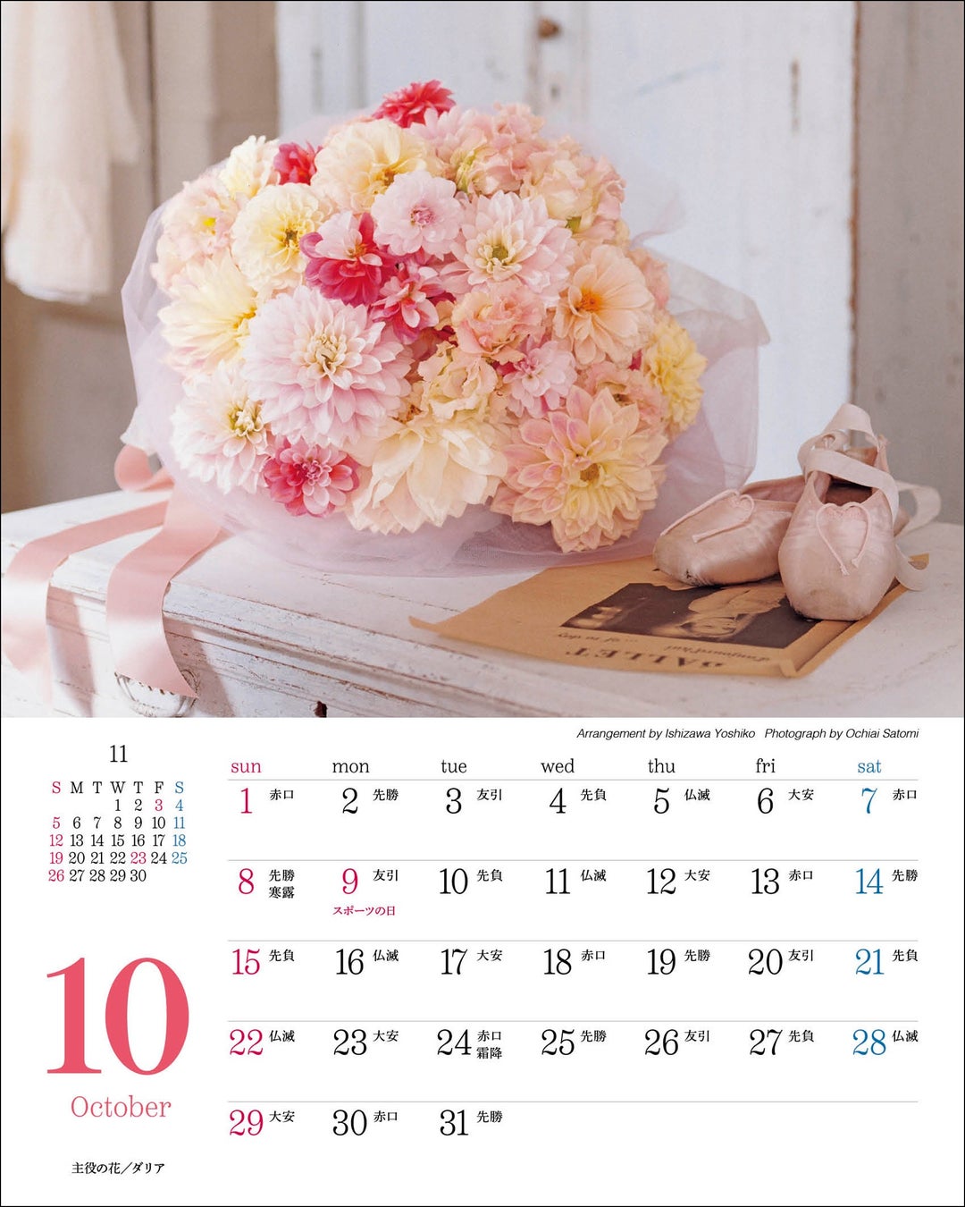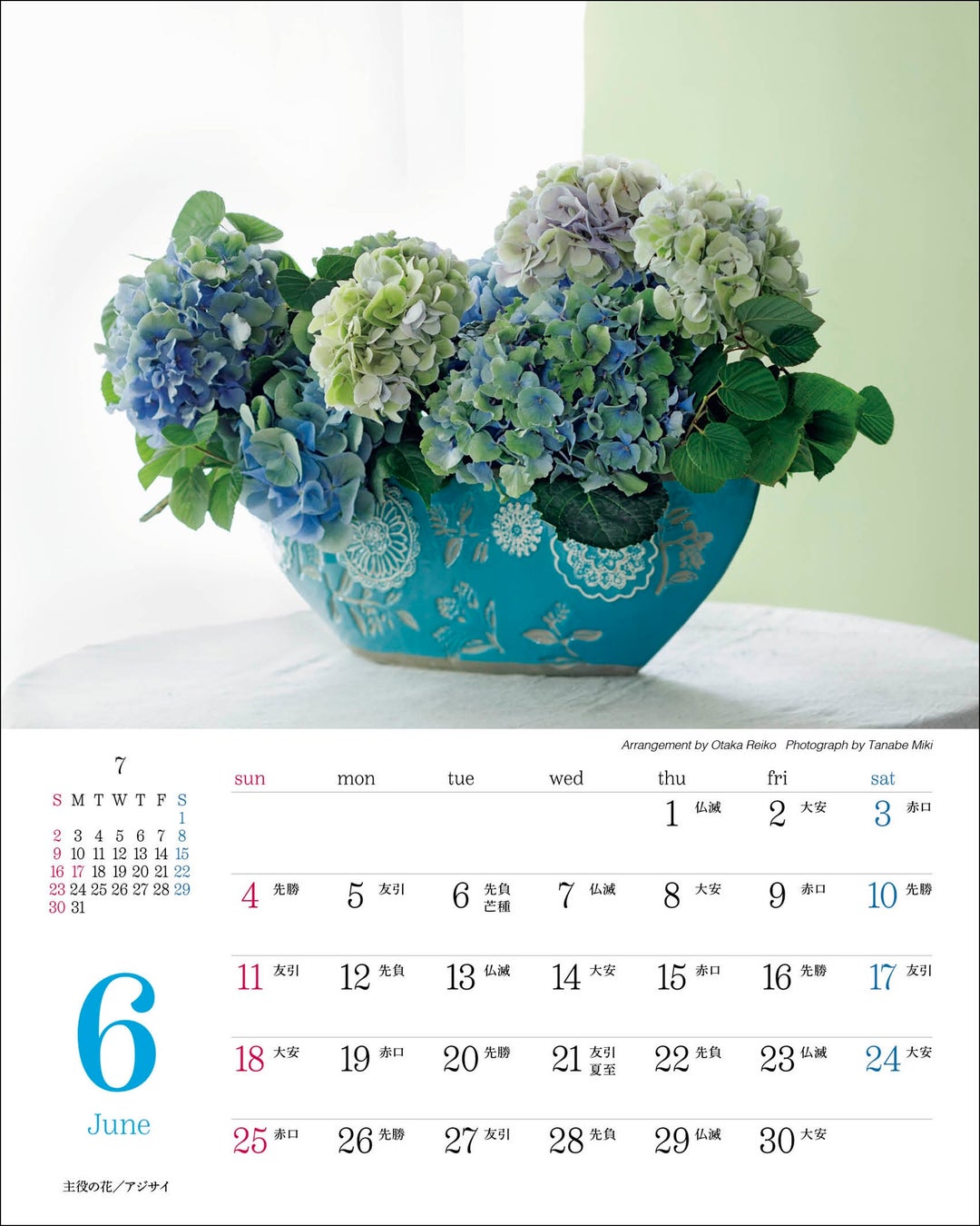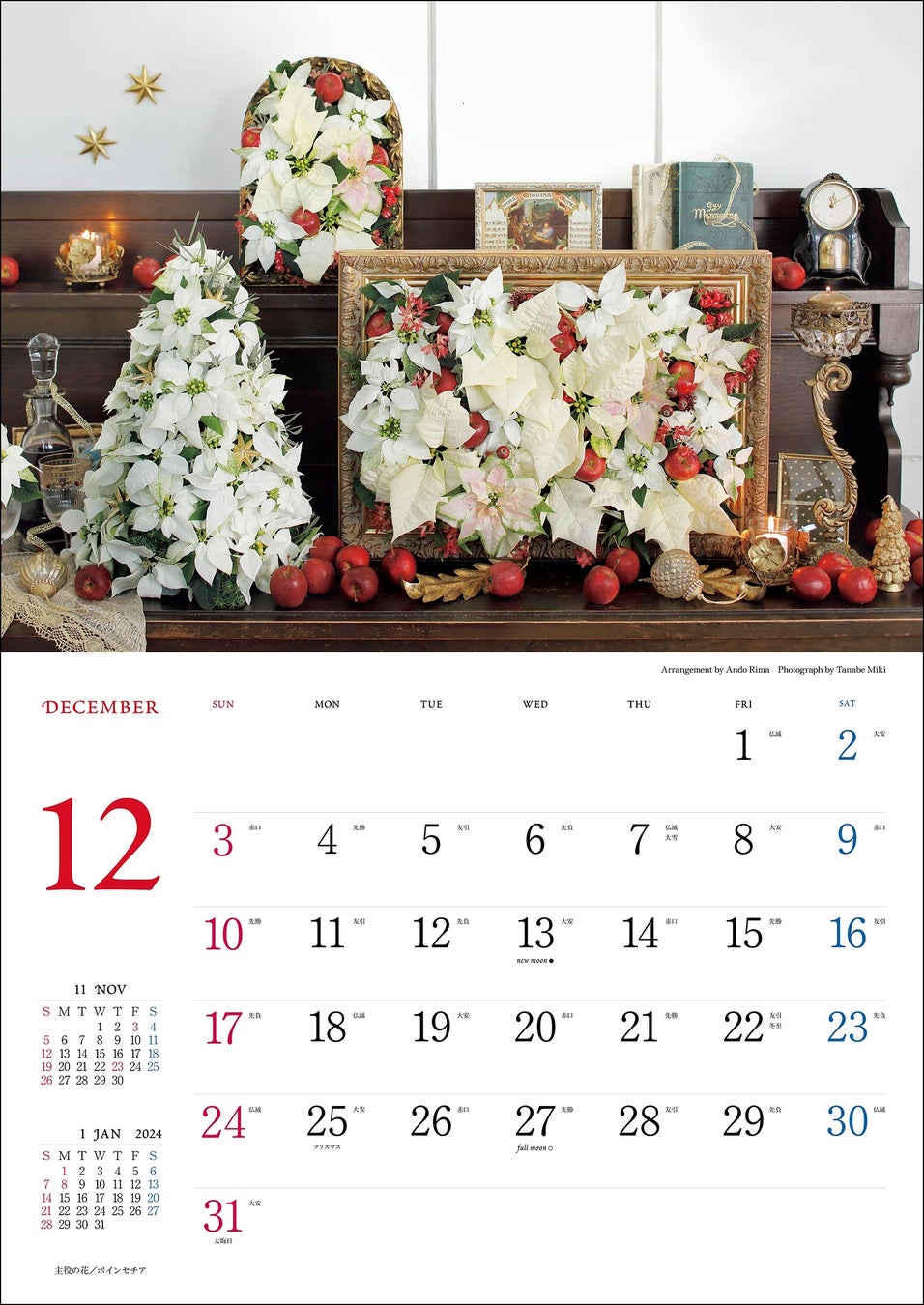 ツバキ、サクラ、アジサイ、トルコギキョウ、コスモス、バラ…と、その月にもっとも美しい花のアレンジで、季節を綴ります。ビジュアルはもちろん、機能も充実したカレンダーです。