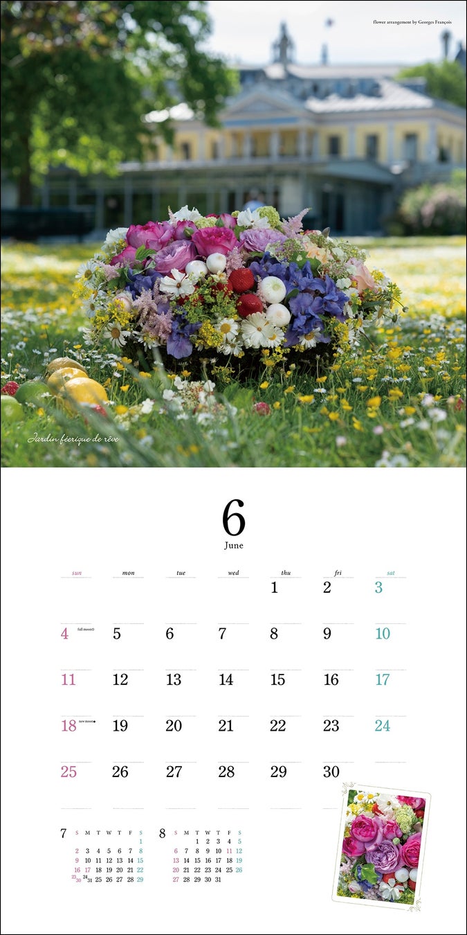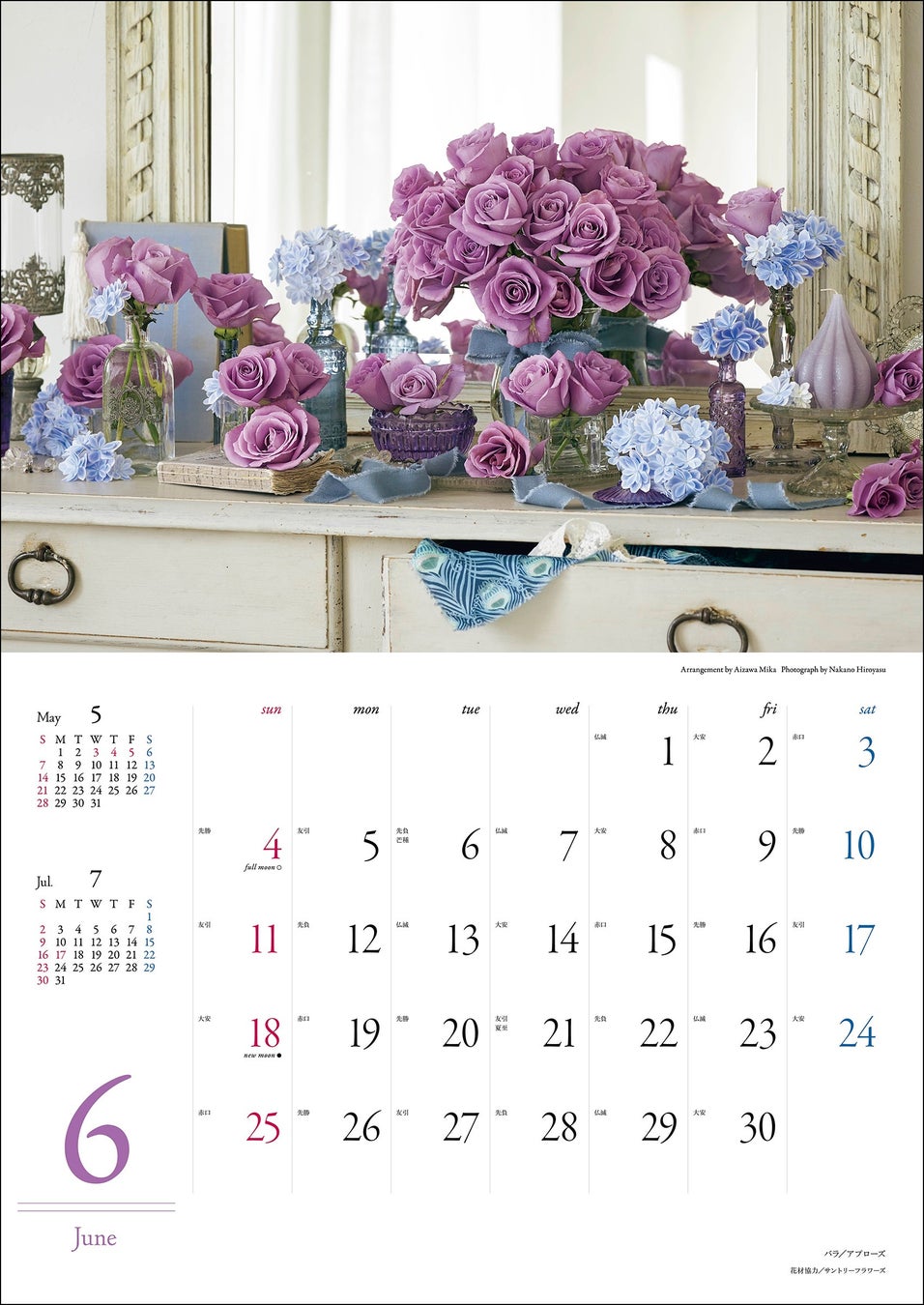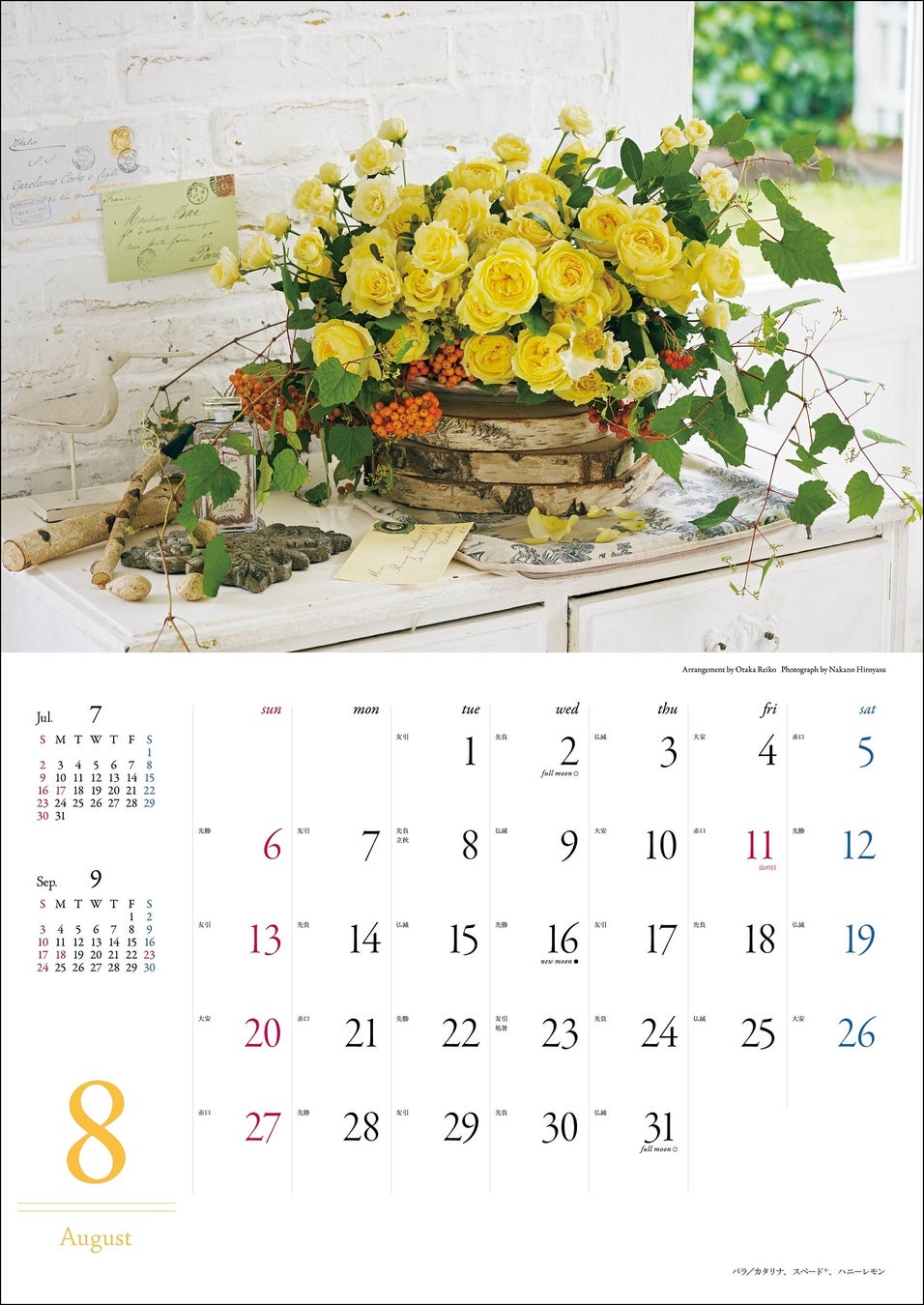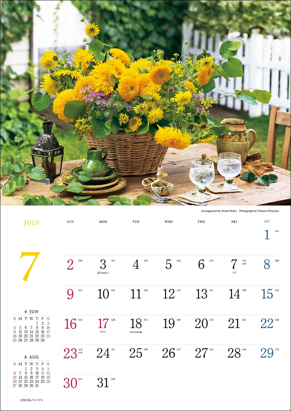 ツバキ、サクラ、アジサイ、トルコギキョウ、コスモス、バラ…と、その月にもっとも美しい花のアレンジで、季節を綴ります。ビジュアルはもちろん、機能も充実したカレンダーです。