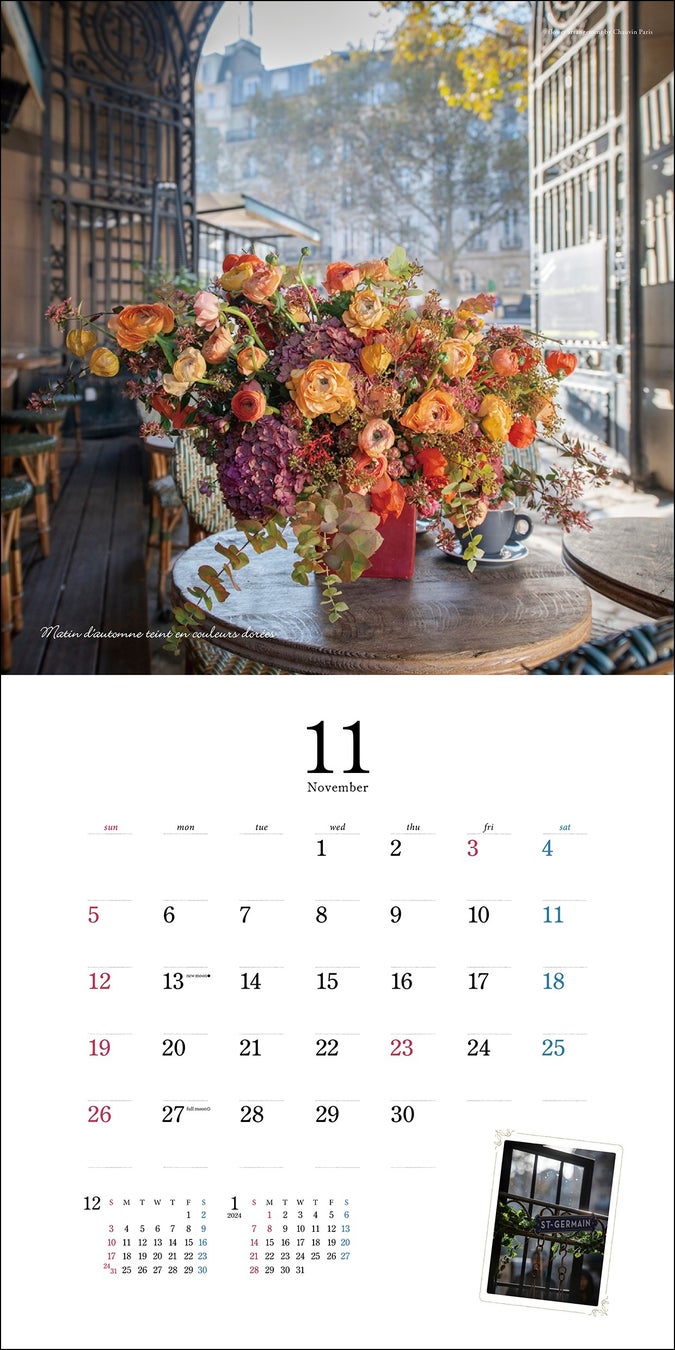 パリのエスプリ溢れる花カレンダーで、眺めるたびに、まるで現地に身を置いているかのような優雅なひと時を味わえます。
