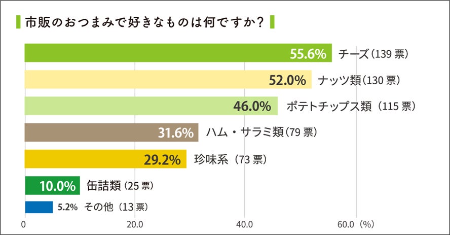 「チーズ」(55.6%)、「ナッツ類」(52.0%)、「ポテトチップス類」(46.0%)が人気。スーパーで手軽に買えるものばかりですね。
