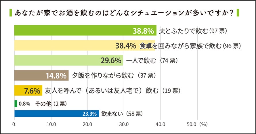 一番多いのは「夫とふたりで飲む」(38.8%)。「一人で飲む」と回答した方は(29.6%)、子育て中の女性ならではの「夕飯を作りながら飲む」は(14.8%)という結果に。「友人を呼んで飲む」(7.6%)はコロナが収束したら増えてきそうですね。